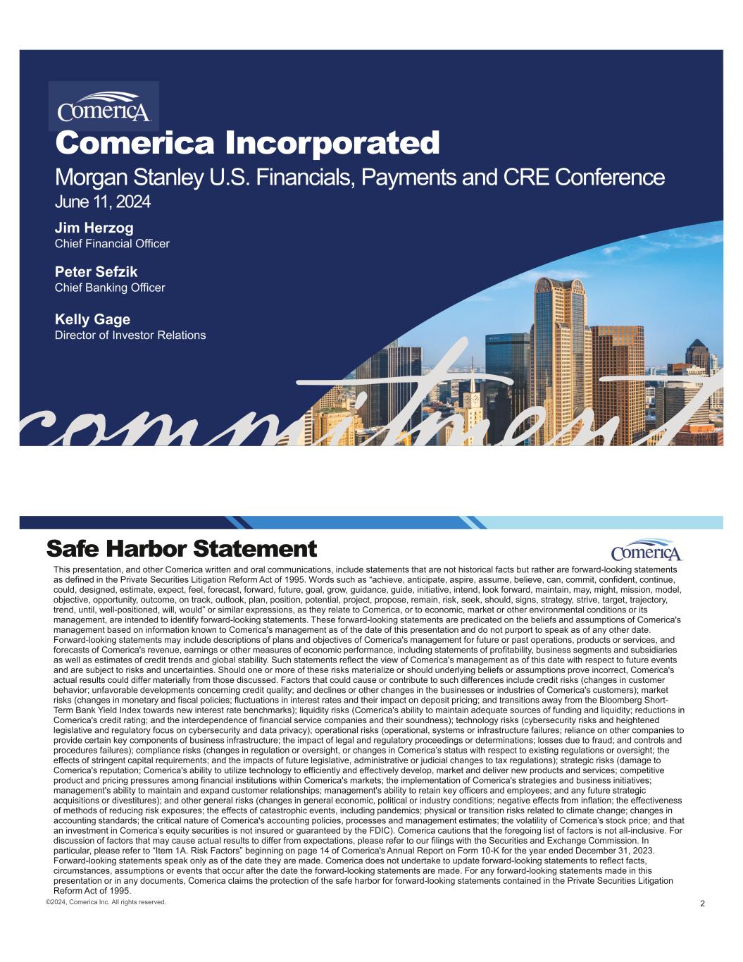 Comerica Incorporated Morgan Stanley U.S. Financials, Payments and CRE Conference June 11, 2024 Jim Herzog Chief Financial Officer Peter Sefzik Chief Banking Officer Kelly Gage Director of Investor Relations This presentation, and other Comerica written and oral communications, include statements that are not historical facts but rather are forward-looking statements as defined in the Private Securities Litigation Reform Act of 1995. Words such as “achieve, anticipate, aspire, assume, believe, can, commit, confident, continue, could, designed, estimate, expect, feel, forecast, forward, future, goal, grow, guidance, guide, initiative, intend, look forward, maintain, may, might, mission, model, objective, opportunity, outcome, on track, outlook, plan, position, potential, project, propose, remain, risk, seek, should, signs, strategy, strive, target, trajectory, trend, until, well-positioned, will, would” or similar expressions, as they relate to Comerica, or to economic, market or other environmental conditions or its management, are intended to identify forward-looking statements. These forward-looking statements are predicated on the beliefs and assumptions of Comerica's management based on information known to Comerica's management as of the date of this presentation and do not purport to speak as of any other date. Forward-looking statements may include descriptions of plans and objectives of Comerica's management for future or past operations, products or services, and forecasts of Comerica's revenue, earnings or other measures of economic performance, including statements of profitability, business segments and subsidiaries as well as estimates of credit trends and global stability. Such statements reflect the view of Comerica's management as of this date with respect to future events and are subject to risks and uncertainties. Should one or more of these risks materialize or should underlying beliefs or assumptions prove incorrect, Comerica's actual results could differ materially from those discussed. Factors that could cause or contribute to such differences include credit risks (changes in customer behavior; unfavorable developments concerning credit quality; and declines or other changes in the businesses or industries of Comerica's customers); market risks (changes in monetary and fiscal policies; fluctuations in interest rates and their impact on deposit pricing; and transitions away from the Bloomberg Short- Term Bank Yield Index towards new interest rate benchmarks); liquidity risks (Comerica's ability to maintain adequate sources of funding and liquidity; reductions in Comerica's credit rating; and the interdependence of financial service companies and their soundness); technology risks (cybersecurity risks and heightened legislative and regulatory focus on cybersecurity and data privacy); operational risks (operational, systems or infrastructure failures; reliance on other companies to provide certain key components of business infrastructure; the impact of legal and regulatory proceedings or determinations; losses due to fraud; and controls and procedures failures); compliance risks (changes in regulation or oversight, or changes in Comerica’s status with respect to existing regulations or oversight; the effects of stringent capital requirements; and the impacts of future legislative, administrative or judicial changes to tax regulations); strategic risks (damage to Comerica's reputation; Comerica's ability to utilize technology to efficiently and effectively develop, market and deliver new products and services; competitive product and pricing pressures among financial institutions within Comerica's markets; the implementation of Comerica's strategies and business initiatives; management's ability to maintain and expand customer relationships; management's ability to retain key officers and employees; and any future strategic acquisitions or divestitures); and other general risks (changes in general economic, political or industry conditions; negative effects from inflation; the effectiveness of methods of reducing risk exposures; the effects of catastrophic events, including pandemics; physical or transition risks related to climate change; changes in accounting standards; the critical nature of Comerica's accounting policies, processes and management estimates; the volatility of Comerica’s stock price; and that an investment in Comerica’s equity securities is not insured or guaranteed by the FDIC). Comerica cautions that the foregoing list of factors is not all-inclusive. For discussion of factors that may cause actual results to differ from expectations, please refer to our filings with the Securities and Exchange Commission. In particular, please refer to “Item 1A. Risk Factors” beginning on page 14 of Comerica's Annual Report on Form 10-K for the year ended December 31, 2023. Forward-looking statements speak only as of the date they are made. Comerica does not undertake to update forward-looking statements to reflect facts, circumstances, assumptions or events that occur after the date the forward-looking statements are made. For any forward-looking statements made in this presentation or in any documents, Comerica claims the protection of the safe harbor for forward-looking statements contained in the Private Securities Litigation Reform Act of 1995. Safe Harbor Statement 2©2024, Comerica Inc. All rights reserved.