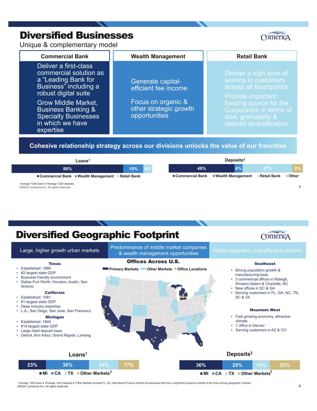Commercial Bank 86% 10% 4% Commercial Bank Wealth Management Retail Bank 49% 6% 37% 8% Commercial Bank Wealth Management Retail Bank Other ©2024, Comerica Inc. All rights reserved. Diversified Businesses Unique & complementary model Loans1 Deposits2 1Average 1Q24 loans 2Average 1Q24 deposits 5 Wealth Management Deliver a first-class commercial solution as a “Leading Bank for Business” including a robust digital suite Grow Middle Market, Business Banking & Specialty Businesses in which we have expertise Generate capital- efficient fee income Focus on organic & other strategic growth opportunities Deliver a high level of service to customers across all touchpoints Provide important funding source for the Corporation in terms of size, granularity & deposit diversification Retail Bank Cohesive relationship strategy across our divisions unlocks the value of our franchise Primary Markets Other Markets Office Locations Diversified Geographic Footprint Texas • Established: 1988 • #2 largest state GDP • Business friendly environment • Dallas-Fort Worth, Houston, Austin, San Antonio California • Established: 1991 • #1 largest state GDP • Deep industry expertise • L.A., San Diego, San Jose, San Francisco Michigan • Established: 1849 • #14 largest state GDP • Large retail deposit base • Detroit, Ann Arbor, Grand Rapids, Lansing Offices Across U.S. Southeast • Strong population growth & manufacturing base • 3 commercial offices in Raleigh, Winston-Salem & Charlotte, NC • New offices in SC & GA • Serving customers in FL, GA, NC, TN, SC & VA Mountain West • Fast growing economy, attractive climate • 1 office in Denver • Serving customers in AZ & CO ©2024, Comerica Inc. All rights reserved. Large, higher growth urban markets Highly integrated, cost-effective platformPredominance of middle market companies & wealth management opportunities 1Average 1Q24 loans 2Average 1Q24 deposits 3Other Markets includes FL, AZ, International Finance Division & businesses that have a significant presence outside of the three primary geographic markets 36% 25% 14% 25% MI CA TX Other Markets 23% 36% 24% 17% MI CA TX Other Markets Loans1 Deposits2 3 3 6