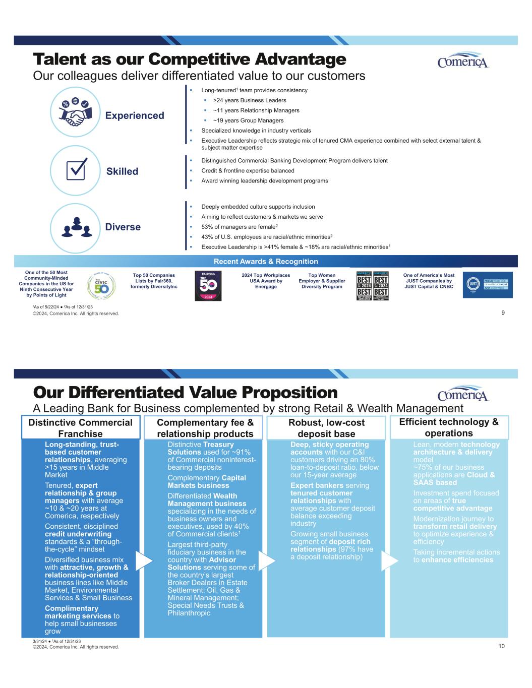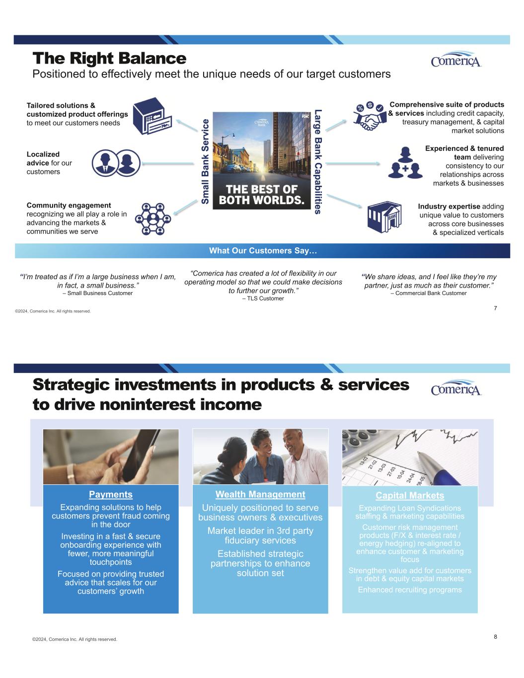 What Our Customers Say… “I’m treated as if I’m a large business when I am, in fact, a small business.” – Small Business Customer “Comerica has created a lot of flexibility in our operating model so that we could make decisions to further our growth.” – TLS Customer “We share ideas, and I feel like they’re my partner, just as much as their customer.” – Commercial Bank Customer ©2024, Comerica Inc. All rights reserved. The Right Balance Positioned to effectively meet the unique needs of our target customers Experienced & tenured team delivering consistency to our relationships across markets & businesses Tailored solutions & customized product offerings to meet our customers needs Localized advice for our customers Industry expertise adding unique value to customers across core businesses & specialized verticals Comprehensive suite of products & services including credit capacity, treasury management, & capital market solutions Community engagement recognizing we all play a role in advancing the markets & communities we serve Large B ank C apabilitiesSm al l B an k Se rv ic e 7 ©2024, Comerica Inc. All rights reserved. Strategic investments in products & services to drive noninterest income Payments Expanding solutions to help customers prevent fraud coming in the door Investing in a fast & secure onboarding experience with fewer, more meaningful touchpoints Focused on providing trusted advice that scales for our customers’ growth Wealth Management Uniquely positioned to serve business owners & executives Market leader in 3rd party fiduciary services Established strategic partnerships to enhance solution set Capital Markets Expanding Loan Syndications staffing & marketing capabilities Customer risk management products (F/X & interest rate / energy hedging) re-aligned to enhance customer & marketing focus Strengthen value add for customers in debt & equity capital markets Enhanced recruiting programs 8