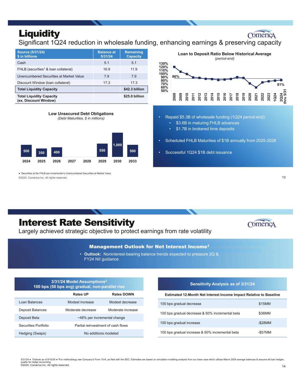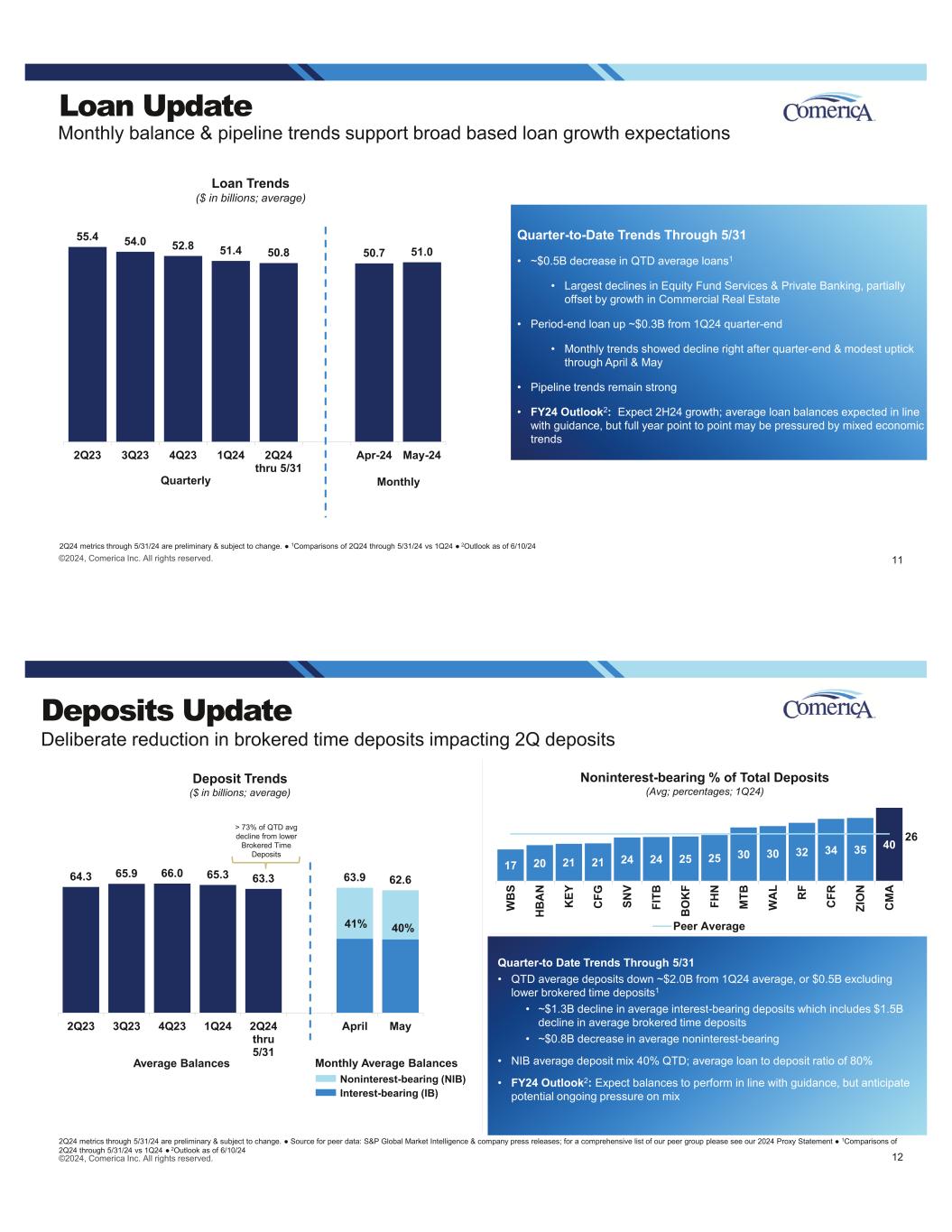 Loan Update Monthly balance & pipeline trends support broad based loan growth expectations 2Q24 metrics through 5/31/24 are preliminary & subject to change. 1Comparisons of 2Q24 through 5/31/24 vs 1Q24 2Outlook as of 6/10/24 11©2024, Comerica Inc. All rights reserved. Loan Trends ($ in billions; average) Quarter-to-Date Trends Through 5/31 • ~$0.5B decrease in QTD average loans1 • Largest declines in Equity Fund Services & Private Banking, partially offset by growth in Commercial Real Estate • Period-end loan up ~$0.3B from 1Q24 quarter-end • Monthly trends showed decline right after quarter-end & modest uptick through April & May • Pipeline trends remain strong • FY24 Outlook2: Expect 2H24 growth; average loan balances expected in line with guidance, but full year point to point may be pressured by mixed economic trends 55.4 54.0 52.8 51.4 50.8 50.7 51.0 2Q23 3Q23 4Q23 1Q24 2Q24 thru 5/31 Apr-24 May-24 MonthlyQuarterly ©2024, Comerica Inc. All rights reserved. 2Q24 metrics through 5/31/24 are preliminary & subject to change. Source for peer data: S&P Global Market Intelligence & company press releases; for a comprehensive list of our peer group please see our 2024 Proxy Statement 1Comparisons of 2Q24 through 5/31/24 vs 1Q24 2Outlook as of 6/10/24 12 Deposits Update Quarter-to Date Trends Through 5/31 • QTD average deposits down ~$2.0B from 1Q24 average, or $0.5B excluding lower brokered time deposits1 • ~$1.3B decline in average interest-bearing deposits which includes $1.5B decline in average brokered time deposits • ~$0.8B decrease in average noninterest-bearing • NIB average deposit mix 40% QTD; average loan to deposit ratio of 80% • FY24 Outlook2: Expect balances to perform in line with guidance, but anticipate potential ongoing pressure on mix Deliberate reduction in brokered time deposits impacting 2Q deposits Deposit Trends ($ in billions; average) Noninterest-bearing % of Total Deposits (Avg; percentages; 1Q24) 17 20 21 21 24 24 25 25 30 30 32 34 35 40 W B S H B A N K EY C FG SN V FI TB B O K F FH N M TB W A L R F C FR ZI O N C M A Peer Average 26 64.3 65.9 66.0 65.3 63.3 63.9 62.6 2Q23 3Q23 4Q23 1Q24 2Q24 thru 5/31 April May Average Balances Monthly Average Balances Noninterest-bearing (NIB) Interest-bearing (IB) 41% 40% > 73% of QTD avg decline from lower Brokered Time Deposits