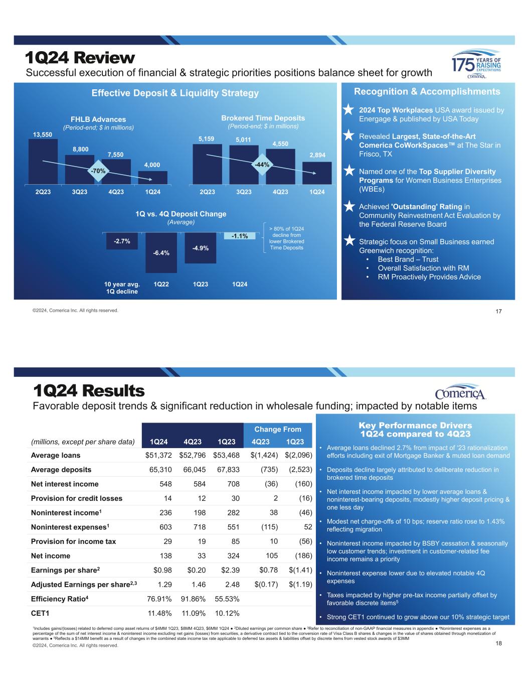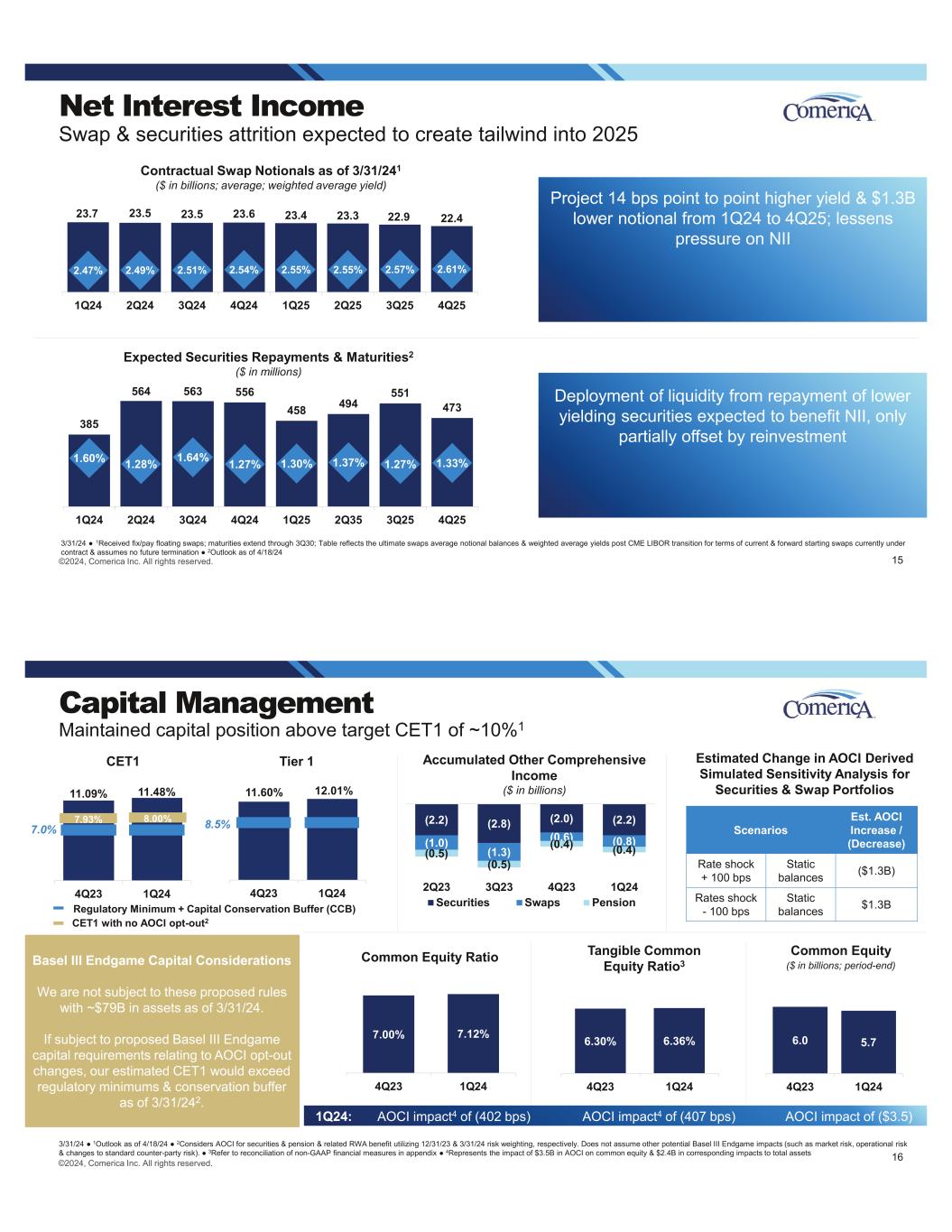 23.7 23.5 23.5 23.6 23.4 23.3 22.9 22.4 2.47% 2.49% 2.51% 2.54% 2.55% 2.55% 2.57% 2.61% 1Q24 2Q24 3Q24 4Q24 1Q25 2Q25 3Q25 4Q25 ©2024, Comerica Inc. All rights reserved. Net Interest Income Expected Securities Repayments & Maturities2 ($ in millions) 385 564 563 556 458 494 551 473 1.60% 1.28% 1.64% 1.27% 1.30% 1.37% 1.27% 1.33% 1Q24 2Q24 3Q24 4Q24 1Q25 2Q35 3Q25 4Q25 Contractual Swap Notionals as of 3/31/241 ($ in billions; average; weighted average yield) Swap & securities attrition expected to create tailwind into 2025 Project 14 bps point to point higher yield & $1.3B lower notional from 1Q24 to 4Q25; lessens pressure on NII Deployment of liquidity from repayment of lower yielding securities expected to benefit NII, only partially offset by reinvestment 3/31/24 1Received fix/pay floating swaps; maturities extend through 3Q30; Table reflects the ultimate swaps average notional balances & weighted average yields post CME LIBOR transition for terms of current & forward starting swaps currently under contract & assumes no future termination 2Outlook as of 4/18/24 15 (2.2) (2.8) (2.0) (2.2) (1.0) (1.3) (0.6) (0.8) (0.5) (0.5) (0.4) (0.4) 2Q23 3Q23 4Q23 1Q24 Securities Swaps Pension 6.30% 6.36% 4Q23 1Q24 Capital Management Maintained capital position above target CET1 of ~10%1 3/31/24 1Outlook as of 4/18/24 2Considers AOCI for securities & pension & related RWA benefit utilizing 12/31/23 & 3/31/24 risk weighting, respectively. Does not assume other potential Basel III Endgame impacts (such as market risk, operational risk & changes to standard counter-party risk). 3Refer to reconciliation of non-GAAP financial measures in appendix 4Represents the impact of $3.5B in AOCI on common equity & $2.4B in corresponding impacts to total assets 11.09% 11.48% 7.0% 4Q23 1Q24 CET1 Tier 1 11.60% 12.01% 8.5% 4Q23 1Q24 Regulatory Minimum + Capital Conservation Buffer (CCB) 16©2024, Comerica Inc. All rights reserved. 6.0 5.7 4Q23 1Q24 Common Equity ($ in billions; period-end) Tangible Common Equity Ratio3 7.00% 7.12% 4Q23 1Q24 Common Equity Ratio Accumulated Other Comprehensive Income ($ in billions) Scenarios Est. AOCI Increase / (Decrease) Rate shock + 100 bps Static balances ($1.3B) Rates shock - 100 bps Static balances $1.3B Estimated Change in AOCI Derived Simulated Sensitivity Analysis for Securities & Swap Portfolios 1Q24: AOCI impact4 of (402 bps) AOCI impact4 of (407 bps) AOCI impact of ($3.5) Basel III Endgame Capital Considerations We are not subject to these proposed rules with ~$79B in assets as of 3/31/24. If subject to proposed Basel III Endgame capital requirements relating to AOCI opt-out changes, our estimated CET1 would exceed regulatory minimums & conservation buffer as of 3/31/242. 7.93% CET1 with no AOCI opt-out2 8.00%