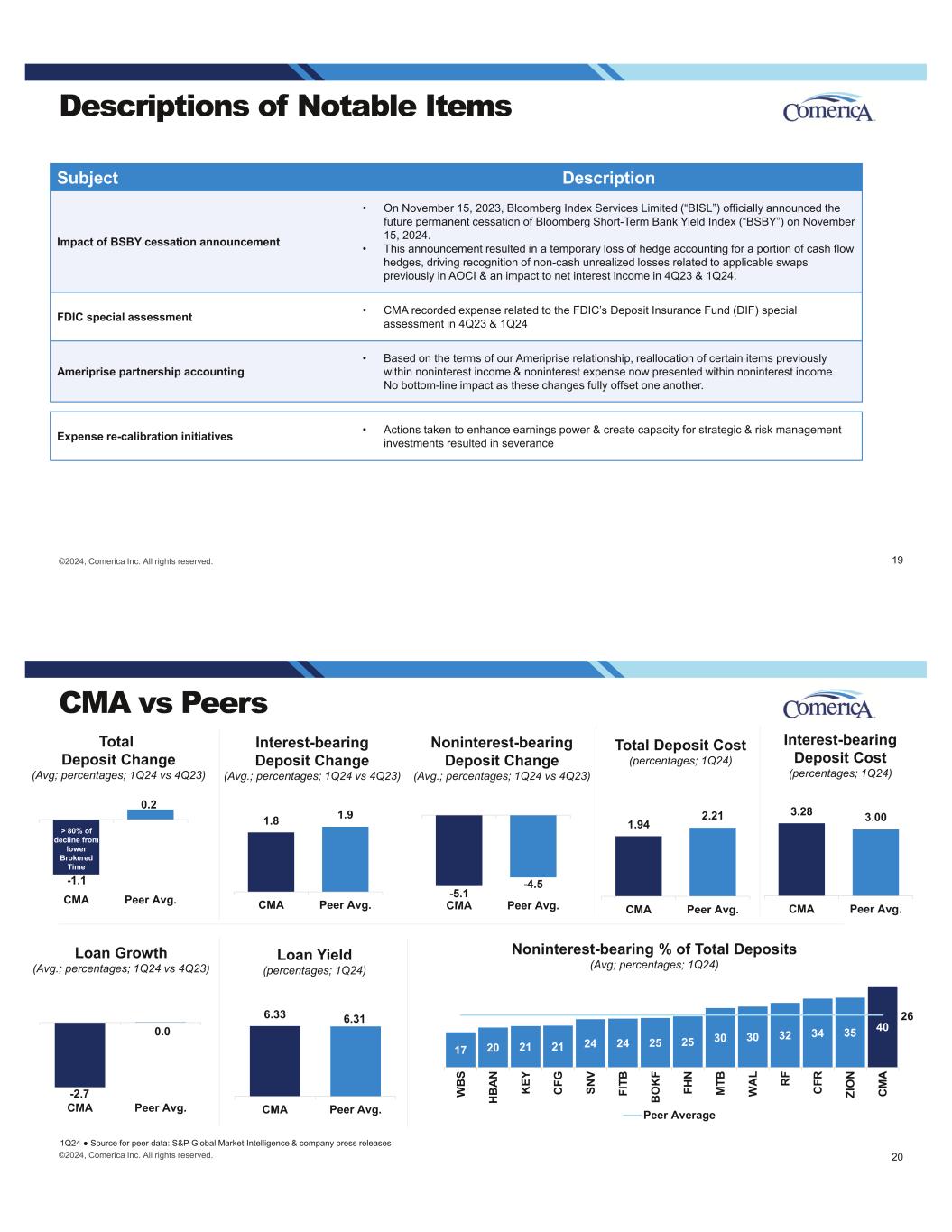 ©2024, Comerica Inc. All rights reserved. Descriptions of Notable Items Subject Description Impact of BSBY cessation announcement • On November 15, 2023, Bloomberg Index Services Limited (“BISL”) officially announced the future permanent cessation of Bloomberg Short-Term Bank Yield Index (“BSBY”) on November 15, 2024. • This announcement resulted in a temporary loss of hedge accounting for a portion of cash flow hedges, driving recognition of non-cash unrealized losses related to applicable swaps previously in AOCI & an impact to net interest income in 4Q23 & 1Q24. FDIC special assessment • CMA recorded expense related to the FDIC’s Deposit Insurance Fund (DIF) special assessment in 4Q23 & 1Q24 Ameriprise partnership accounting • Based on the terms of our Ameriprise relationship, reallocation of certain items previously within noninterest income & noninterest expense now presented within noninterest income. No bottom-line impact as these changes fully offset one another. Expense re-calibration initiatives • Actions taken to enhance earnings power & create capacity for strategic & risk management investments resulted in severance charges 19 1.94 2.21 CMA Peer Avg. 17 20 21 21 24 24 25 25 30 30 32 34 35 40 W B S H B A N K EY C FG SN V FI TB B O K F FH N M TB W A L R F C FR ZI O N C M A Peer Average -5.1 -4.5 CMA Peer Avg. Noninterest-bearing Deposit Change (Avg.; percentages; 1Q24 vs 4Q23) Interest-bearing Deposit Change (Avg.; percentages; 1Q24 vs 4Q23) 1.8 1.9 CMA Peer Avg. CMA vs Peers 1Q24 Source for peer data: S&P Global Market Intelligence & company press releases Interest-bearing Deposit Cost (percentages; 1Q24) 20©2024, Comerica Inc. All rights reserved. Noninterest-bearing % of Total Deposits (Avg; percentages; 1Q24) Total Deposit Change (Avg; percentages; 1Q24 vs 4Q23) 3.28 3.00 CMA Peer Avg. -2.7 0.0 CMA Peer Avg. Loan Growth (Avg.; percentages; 1Q24 vs 4Q23) Loan Yield (percentages; 1Q24) 6.33 6.31 CMA Peer Avg. 26 Total Deposit Cost (percentages; 1Q24) -1.1 0.2 CMA Peer Avg. > 80% of decline from lower Brokered Time