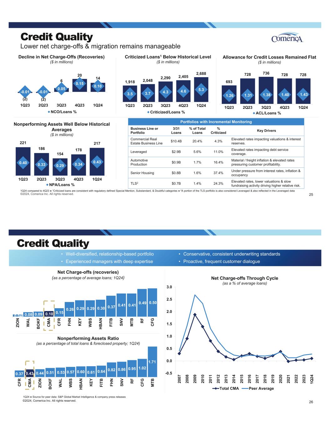 221 186 154 178 217 0.40 0.33 0.29 0.34 0.43 (0.10) 0.10 0.30 0.50 0.70 0.90 1.10 1.30 1.50 1Q23 2Q23 3Q23 4Q23 1Q24 NPA/Loans % Credit Quality Lower net charge-offs & migration remains manageable 1Q24 compared to 4Q23 1Criticized loans are consistent with regulatory defined Special Mention, Substandard, & Doubtful categories 2A portion of the TLS portfolio is also considered Leveraged & also reflected in the Leveraged data Nonperforming Assets Well Below Historical Averages ($ in millions) Criticized Loans1 Below Historical Level ($ in millions) 693 728 736 728 728 1.26 1.31 1.38 1.40 1.43 - 1.00 2.00 3.00 4.00 5.00 6.00 1Q23 2Q23 3Q23 4Q23 1Q24 ACL/Loans % Allowance for Credit Losses Remained Flat ($ in millions) 1,918 2,048 2,290 2,405 2,688 3.5 3.7 4.3 4.6 5.3 - 2.00 4.00 6.00 8.00 10.00 12.00 1Q23 2Q23 3Q23 4Q23 1Q24 Criticized/Loans % 25©2024, Comerica Inc. All rights reserved. (2) (2) 6 20 14 -0.01 -0.01 0.05 0.15 0.10 (0.20) (0.15) (0.10) (0.05) - 0.05 0.10 0.15 0.20 0.25 0.30 1Q23 2Q23 3Q23 4Q23 1Q24 NCO/Loans % Decline in Net Charge-Offs (Recoveries) ($ in millions) Portfolios with Incremental Monitoring Business Line or Portfolio 3/31 Loans % of Total Loans % Criticized Key Drivers Commercial Real Estate Business Line $10.4B 20.4% 4.3% Elevated rates impacting valuations & interest reserves. Leveraged $2.9B 5.6% 11.0% Elevated rates impacting debt service coverage. Automotive Production $0.9B 1.7% 16.4% Material / freight inflation & elevated rates pressuring customer profitability. Senior Housing $0.8B 1.6% 37.4% Under pressure from interest rates, inflation & occupancy TLS2 $0.7B 1.4% 24.3% Elevated rates, lower valuations & slow fundraising activity driving higher relative risk. 0.04 0.08 0.09 0.10 0.15 0.26 0.29 0.29 0.30 0.37 0.41 0.41 0.49 0.50 ZI O N W A L B O K F C M A C FR FH N K EY W B S H B A N FI TB SN V M TB R F C FG Credit Quality 1Q24 Source for peer data: S&P Global Market Intelligence & company press releases Nonperforming Assets Ratio (as a percentage of total loans & foreclosed property; 1Q24) • Well-diversified, relationship-based portfolio • Experienced managers with deep expertise • Conservative, consistent underwriting standards • Proactive, frequent customer dialogue -0.5 0.0 0.5 1.0 1.5 2.0 2.5 3.0 20 07 20 08 20 09 20 10 20 11 20 12 20 13 20 14 20 15 20 16 20 17 20 18 20 19 20 20 20 21 20 22 20 23 1Q 24 Total CMA Peer Average Net Charge-offs Through Cycle (as a % of average loans) ©2024, Comerica Inc. All rights reserved. 26 Net Charge-offs (recoveries) (as a percentage of average loans; 1Q24) 0.37 0.43 0.44 0.51 0.53 0.57 0.60 0.61 0.64 0.82 0.86 0.95 1.02 1.71 C FR C M A ZI O N B O K F W A L W B S H B A N K EY FI TB FH N SN V R F C FG M TB