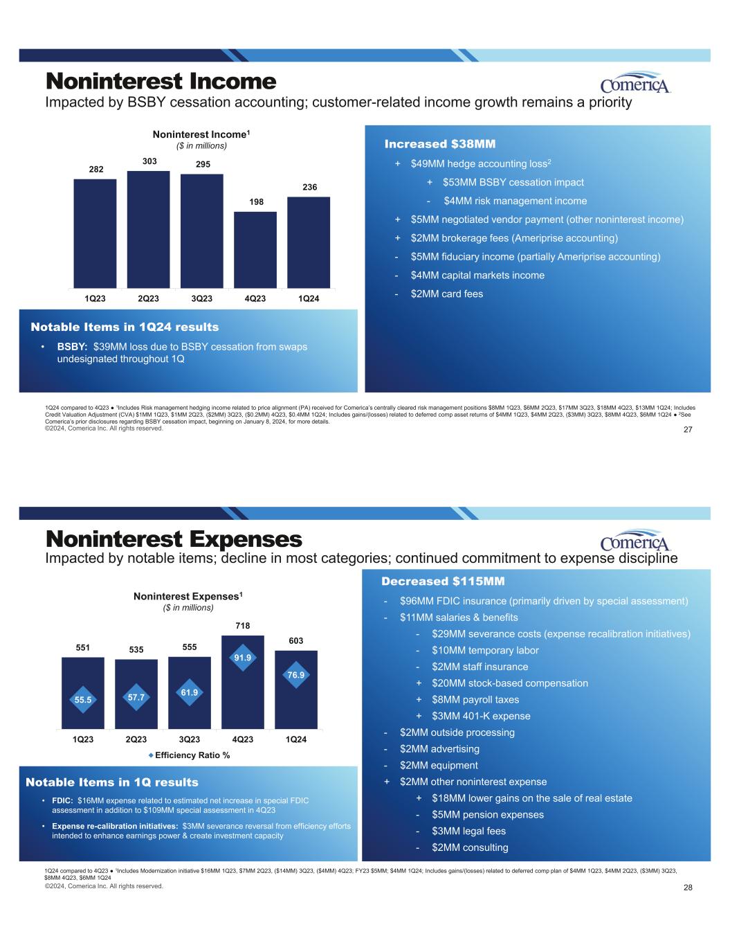 Noninterest Income Impacted by BSBY cessation accounting; customer-related income growth remains a priority 1Q24 compared to 4Q23 1Includes Risk management hedging income related to price alignment (PA) received for Comerica’s centrally cleared risk management positions $8MM 1Q23, $6MM 2Q23, $17MM 3Q23, $18MM 4Q23, $13MM 1Q24; Includes Credit Valuation Adjustment (CVA) $1MM 1Q23, $1MM 2Q23, ($2MM) 3Q23, ($0.2MM) 4Q23, $0.4MM 1Q24; Includes gains/(losses) related to deferred comp asset returns of $4MM 1Q23, $4MM 2Q23, ($3MM) 3Q23, $8MM 4Q23, $6MM 1Q24 2See Comerica’s prior disclosures regarding BSBY cessation impact, beginning on January 8, 2024, for more details. Noninterest Income1 ($ in millions) 282 303 295 198 236 1Q23 2Q23 3Q23 4Q23 1Q24 Increased $38MM + $49MM hedge accounting loss2 + $53MM BSBY cessation impact - $4MM risk management income + $5MM negotiated vendor payment (other noninterest income) + $2MM brokerage fees (Ameriprise accounting) - $5MM fiduciary income (partially Ameriprise accounting) - $4MM capital markets income - $2MM card fees 27©2024, Comerica Inc. All rights reserved. Notable Items in 1Q24 results • BSBY: $39MM loss due to BSBY cessation from swaps undesignated throughout 1Q 551 535 555 718 603 55.5 57.7 61.9 91.9 76.9 1Q23 2Q23 3Q23 4Q23 1Q24 Efficiency Ratio % Noninterest Expenses1 ($ in millions) Noninterest Expenses Impacted by notable items; decline in most categories; continued commitment to expense discipline 1Q24 compared to 4Q23 1Includes Modernization initiative $16MM 1Q23, $7MM 2Q23, ($14MM) 3Q23, ($4MM) 4Q23; FY23 $5MM; $4MM 1Q24; Includes gains/(losses) related to deferred comp plan of $4MM 1Q23, $4MM 2Q23, ($3MM) 3Q23, $8MM 4Q23, $6MM 1Q24 Decreased $115MM - $96MM FDIC insurance (primarily driven by special assessment) - $11MM salaries & benefits - $29MM severance costs (expense recalibration initiatives) - $10MM temporary labor - $2MM staff insurance + $20MM stock-based compensation + $8MM payroll taxes + $3MM 401-K expense - $2MM outside processing - $2MM advertising - $2MM equipment + $2MM other noninterest expense + $18MM lower gains on the sale of real estate - $5MM pension expenses - $3MM legal fees - $2MM consulting 28©2024, Comerica Inc. All rights reserved. Notable Items in 1Q results • FDIC: $16MM expense related to estimated net increase in special FDIC assessment in addition to $109MM special assessment in 4Q23 • Expense re-calibration initiatives: $3MM severance reversal from efficiency efforts intended to enhance earnings power & create investment capacity
