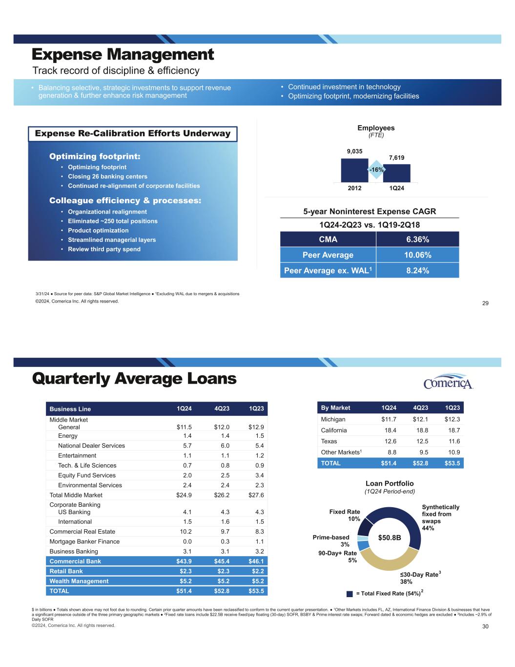 9,035 7,619 2012 1Q24 Expense Management Track record of discipline & efficiency 3/31/24 Source for peer data: S&P Global Market Intelligence 1Excluding WAL due to mergers & acquisitions Employees (FTE) • Balancing selective, strategic investments to support revenue generation & further enhance risk management • Continued investment in technology • Optimizing footprint, modernizing facilities -16% 29©2024, Comerica Inc. All rights reserved. 5-year Noninterest Expense CAGR 1Q24-2Q23 vs. 1Q19-2Q18 CMA 6.36% Peer Average 10.06% Peer Average ex. WAL1 8.24% Optimizing footprint: • Optimizing footprint • Closing 26 banking centers • Continued re-alignment of corporate facilities Colleague efficiency & processes: • Organizational realignment • Eliminated ~250 total positions • Product optimization • Streamlined managerial layers • Review third party spend Expense Re-Calibration Efforts Underway = Total Fixed Rate (54%) Business Line 1Q24 4Q23 1Q23 Middle Market General $11.5 $12.0 $12.9 Energy 1.4 1.4 1.5 National Dealer Services 5.7 6.0 5.4 Entertainment 1.1 1.1 1.2 Tech. & Life Sciences 0.7 0.8 0.9 Equity Fund Services 2.0 2.5 3.4 Environmental Services 2.4 2.4 2.3 Total Middle Market $24.9 $26.2 $27.6 Corporate Banking US Banking 4.1 4.3 4.3 International 1.5 1.6 1.5 Commercial Real Estate 10.2 9.7 8.3 Mortgage Banker Finance 0.0 0.3 1.1 Business Banking 3.1 3.1 3.2 Commercial Bank $43.9 $45.4 $46.1 Retail Bank $2.3 $2.3 $2.2 Wealth Management $5.2 $5.2 $5.2 TOTAL $51.4 $52.8 $53.5 Quarterly Average Loans $ in billions Totals shown above may not foot due to rounding. Certain prior quarter amounts have been reclassified to conform to the current quarter presentation. 1Other Markets includes FL, AZ, International Finance Division & businesses that have a significant presence outside of the three primary geographic markets 2Fixed rate loans include $22.5B receive fixed/pay floating (30-day) SOFR, BSBY & Prime interest rate swaps; Forward dated & economic hedges are excluded 3Includes ~2.9% of Daily SOFR By Market 1Q24 4Q23 1Q23 Michigan $11.7 $12.1 $12.3 California 18.4 18.8 18.7 Texas 12.6 12.5 11.6 Other Markets1 8.8 9.5 10.9 TOTAL $51.4 $52.8 $53.5 ©2024, Comerica Inc. All rights reserved. 30 Fixed Rate 10% Synthetically fixed from swaps 44% -Day Rate 38% 90-Day+ Rate 5% Prime-based 3% 2 Loan Portfolio (1Q24 Period-end) 3 $50.8B