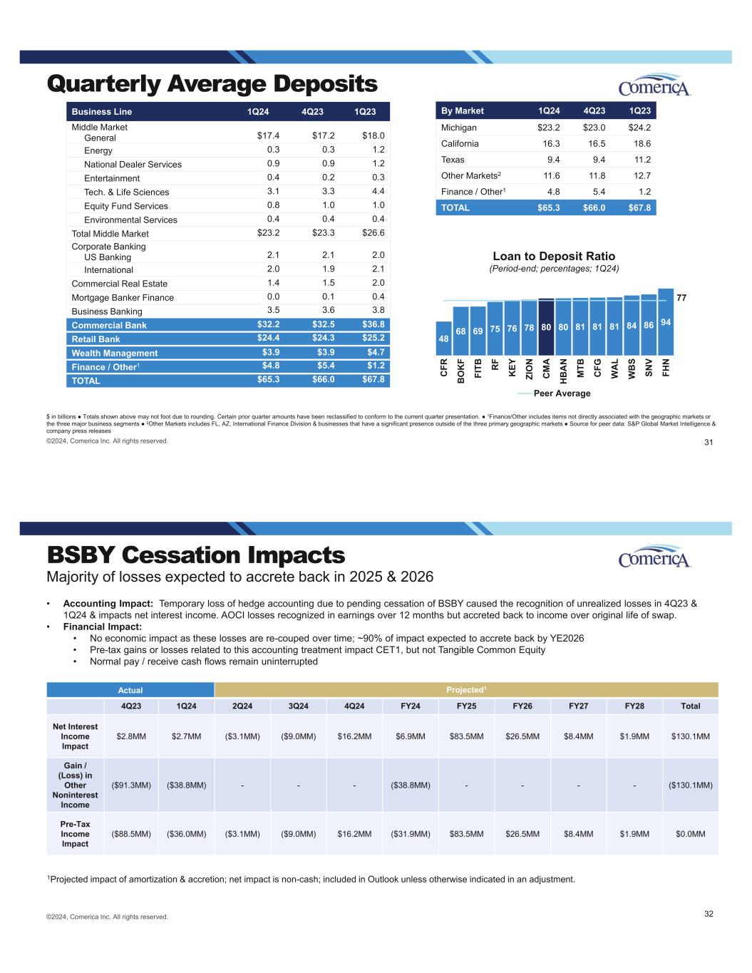 Quarterly Average Deposits $ in billions Totals shown above may not foot due to rounding. Certain prior quarter amounts have been reclassified to conform to the current quarter presentation. 1Finance/Other includes items not directly associated with the geographic markets or the three major business segments 2Other Markets includes FL, AZ, International Finance Division & businesses that have a significant presence outside of the three primary geographic markets Source for peer data: S&P Global Market Intelligence & company press releases Business Line 1Q24 4Q23 1Q23 Middle Market General $17.4 $17.2 $18.0 Energy 0.3 0.3 1.2 National Dealer Services 0.9 0.9 1.2 Entertainment 0.4 0.2 0.3 Tech. & Life Sciences 3.1 3.3 4.4 Equity Fund Services 0.8 1.0 1.0 Environmental Services 0.4 0.4 0.4 Total Middle Market $23.2 $23.3 $26.6 Corporate Banking US Banking 2.1 2.1 2.0 International 2.0 1.9 2.1 Commercial Real Estate 1.4 1.5 2.0 Mortgage Banker Finance 0.0 0.1 0.4 Business Banking 3.5 3.6 3.8 Commercial Bank $32.2 $32.5 $36.8 Retail Bank $24.4 $24.3 $25.2 Wealth Management $3.9 $3.9 $4.7 Finance / Other1 $4.8 $5.4 $1.2 TOTAL $65.3 $66.0 $67.8 By Market 1Q24 4Q23 1Q23 Michigan $23.2 $23.0 $24.2 California 16.3 16.5 18.6 Texas 9.4 9.4 11.2 Other Markets2 11.6 11.8 12.7 Finance / Other1 4.8 5.4 1.2 TOTAL $65.3 $66.0 $67.8 ©2024, Comerica Inc. All rights reserved. 31 Loan to Deposit Ratio (Period-end; percentages; 1Q24) 48 68 69 75 76 78 80 80 81 81 81 84 86 94 C FR B O K F FI TB R F K EY ZI O N C M A H B A N M TB C FG W A L W B S SN V FH N Peer Average 77 ©2024, Comerica Inc. All rights reserved. BSBY Cessation Impacts Actual Projected1 4Q23 1Q24 2Q24 3Q24 4Q24 FY24 FY25 FY26 FY27 FY28 Total Net Interest Income Impact $2.8MM $2.7MM ($3.1MM) ($9.0MM) $16.2MM $6.9MM $83.5MM $26.5MM $8.4MM $1.9MM $130.1MM Gain / (Loss) in Other Noninterest Income ($91.3MM) ($38.8MM) - - - ($38.8MM) - - - - ($130.1MM) Pre-Tax Income Impact ($88.5MM) ($36.0MM) ($3.1MM) ($9.0MM) $16.2MM ($31.9MM) $83.5MM $26.5MM $8.4MM $1.9MM $0.0MM • Accounting Impact: Temporary loss of hedge accounting due to pending cessation of BSBY caused the recognition of unrealized losses in 4Q23 & 1Q24 & impacts net interest income. AOCI losses recognized in earnings over 12 months but accreted back to income over original life of swap. • Financial Impact: • No economic impact as these losses are re-couped over time; ~90% of impact expected to accrete back by YE2026 • Pre-tax gains or losses related to this accounting treatment impact CET1, but not Tangible Common Equity • Normal pay / receive cash flows remain uninterrupted 1Projected impact of amortization & accretion; net impact is non-cash; included in Outlook unless otherwise indicated in an adjustment. Majority of losses expected to accrete back in 2025 & 2026 32