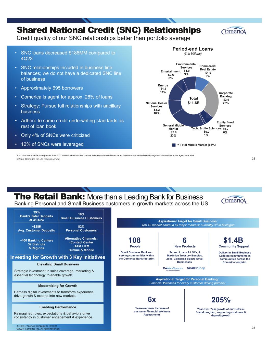 Shared National Credit (SNC) Relationships Credit quality of our SNC relationships better than portfolio average • SNC loans decreased $186MM compared to 4Q23 • SNC relationships included in business line balances; we do not have a dedicated SNC line of business • Approximately 695 borrowers • Comerica is agent for approx. 28% of loans • Strategy: Pursue full relationships with ancillary business • Adhere to same credit underwriting standards as rest of loan book • Only 4% of SNCs were criticized • 12% of SNCs were leveraged Period-end Loans ($ in billions) Commercial Real Estate $1.0 9% Corporate Banking $2.9 25% Equity Fund Services $0.7 6% Tech. & Life Sciences $0.2 1% General Middle Market $2.6 23% National Dealer Services $1.2 10% Energy $1.3 11% Entertainment $0.6 6% Environmental Services $1.0 9% = Total Middle Market (66%) Total $11.6B ©2024, Comerica Inc. All rights reserved. 3/31/24 SNCs are facilities greater than $100 million shared by three or more federally supervised financial institutions which are reviewed by regulatory authorities at the agent bank level 33 Year-over-Year growth of our Refer-a- Friend program, supporting customer & deposit growth 205%1 Investing for Growth with 3 Key Initiatives Elevating Small Business Strategic investment in sales coverage, marketing & essential technology to enable growth. Enabling Performance Reimagined roles, expectations & behaviors drive consistency in customer engagement & experience. Modernizing for Growth Harness digital investments to transform experience, drive growth & expand into new markets. 108 6 $1.4B Dollars in Small Business Lending commitments in communities across the Comerica footprint Small Business Bankers, serving communities within the Comerica Bank footprint 6x Year-over-Year increase of customer Financial Wellness ©2024, Comerica Inc. All rights reserved. The Retail Bank: More than a Leading Bank for Business Banking Personal and Small Business customers in growth markets across the US 3/31/24 112/31/23 compared to 12/31/22 Aspirational Target for Small Business: Top 10 market share in all major markets; currently 3rd in Michigan Aspirational Target for Personal Banking: Scored Loans & LOCs, 2 Maximize Treasury Bundles, Zelle, Comerica SizeUp Small Businesses People New Products Community Support 39% at 3/31/24 ~$28K Avg. Customer Deposits 82% Personal Customers ~400 Banking Centers 32 Districts 5 Regions Alternative Channels: •Contact Center •ATM / ITM •Online & Mobile 34