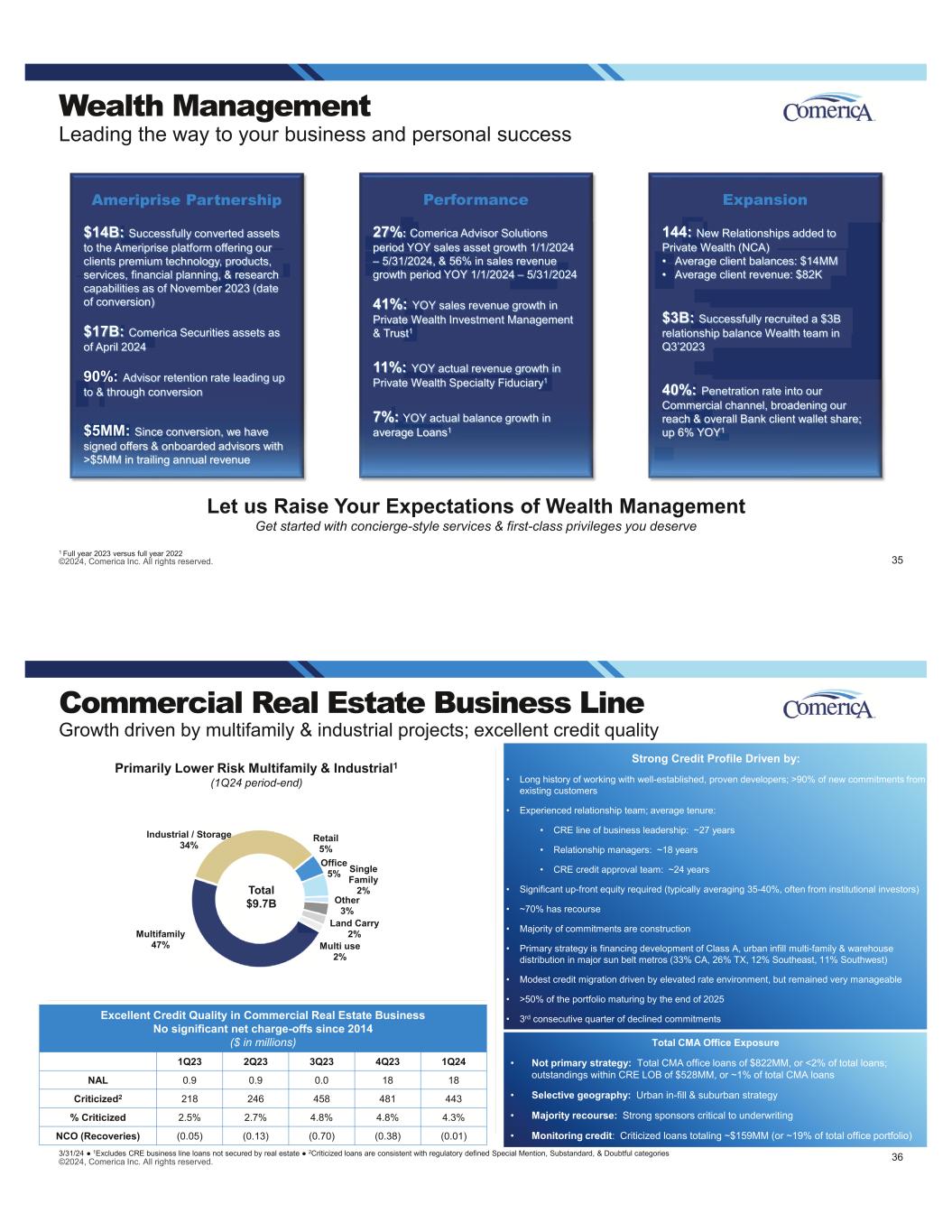 ©2024, Comerica Inc. All rights reserved. Wealth Management Leading the way to your business and personal success Performance 27%: Comerica Advisor Solutions period YOY sales asset growth 1/1/2024 – 5/31/2024, & 56% in sales revenue growth period YOY 1/1/2024 – 5/31/2024 41%: YOY sales revenue growth in Private Wealth Investment Management & Trust1 11%: YOY actual revenue growth in Private Wealth Specialty Fiduciary1 7%: YOY actual balance growth in average Loans1 Ameriprise Partnership $14B: Successfully converted assets to the Ameriprise platform offering our clients premium technology, products, services, financial planning, & research capabilities as of November 2023 (date of conversion) $17B: Comerica Securities assets as of April 2024 90%: Advisor retention rate leading up to & through conversion $5MM: Since conversion, we have signed offers & onboarded advisors with >$5MM in trailing annual revenue Expansion 144: New Relationships added to Private Wealth (NCA) • Average client balances: $14MM • Average client revenue: $82K $3B: Successfully recruited a $3B relationship balance Wealth team in Q3’2023 40%: Penetration rate into our Commercial channel, broadening our reach & overall Bank client wallet share; up 6% YOY1 Let us Raise Your Expectations of Wealth Management Get started with concierge-style services & first-class privileges you deserve 1 Full year 2023 versus full year 2022 35 Total CMA Office Exposure • Not primary strategy: Total CMA office loans of $822MM, or <2% of total loans; outstandings within CRE LOB of $528MM, or ~1% of total CMA loans • Selective geography: Urban in-fill & suburban strategy • Majority recourse: Strong sponsors critical to underwriting • Monitoring credit: Criticized loans totaling ~$159MM (or ~19% of total office portfolio) Multifamily 47% Industrial / Storage 34% Retail 5% Office 5% Single Family 2% Other 3% Land Carry 2% Multi use 2% Commercial Real Estate Business Line Growth driven by multifamily & industrial projects; excellent credit quality 3/31/24 1Excludes CRE business line loans not secured by real estate 2Criticized loans are consistent with regulatory defined Special Mention, Substandard, & Doubtful categories Primarily Lower Risk Multifamily & Industrial1 (1Q24 period-end) Total $9.7B Strong Credit Profile Driven by: • Long history of working with well-established, proven developers; >90% of new commitments from existing customers • Experienced relationship team; average tenure: • CRE line of business leadership: ~27 years • Relationship managers: ~18 years • CRE credit approval team: ~24 years • Significant up-front equity required (typically averaging 35-40%, often from institutional investors) • ~70% has recourse • Majority of commitments are construction • Primary strategy is financing development of Class A, urban infill multi-family & warehouse distribution in major sun belt metros (33% CA, 26% TX, 12% Southeast, 11% Southwest) • Modest credit migration driven by elevated rate environment, but remained very manageable • >50% of the portfolio maturing by the end of 2025 • 3rd consecutive quarter of declined commitments ©2024, Comerica Inc. All rights reserved. 36 Excellent Credit Quality in Commercial Real Estate Business No significant net charge-offs since 2014 ($ in millions) 1Q23 2Q23 3Q23 4Q23 1Q24 NAL 0.9 0.9 0.0 18 18 Criticized2 218 246 458 481 443 % Criticized 2.5% 2.7% 4.8% 4.8% 4.3% NCO (Recoveries) (0.05) (0.13) (0.70) (0.38) (0.01)