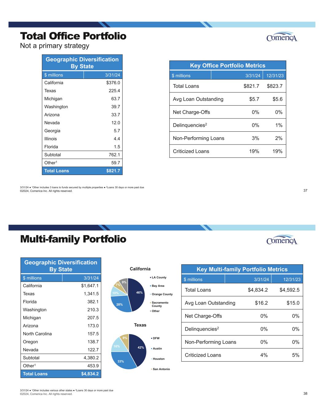 ©2024, Comerica Inc. All rights reserved. Total Office Portfolio Not a primary strategy Geographic Diversification By State $ millions 3/31/24 California $376.0 Texas 225.4 Michigan 63.7 Washington 39.7 Arizona 33.7 Nevada 12.0 Georgia 5.7 Illinois 4.4 Florida 1.5 Subtotal 762.1 Other1 59.7 Total Loans $821.7 Key Office Portfolio Metrics $ millions 3/31/24 12/31/23 Total Loans $821.7 $823.7 Avg Loan Outstanding $5.7 $5.6 Net Charge-Offs 0% 0% Delinquencies2 0% 1% Non-Performing Loans 3% 2% Criticized Loans 19% 19% 3/31/24 1Other includes 3 loans to funds secured by multiple properties 2Loans 30 days or more past due 37 ©2024, Comerica Inc. All rights reserved. Multi-family Portfolio Geographic Diversification By State $ millions 3/31/24 California $1,647.1 Texas 1,341.5 Florida 382.1 Washington 210.3 Michigan 207.5 Arizona 173.0 North Carolina 157.5 Oregon 138.7 Nevada 122.7 Subtotal 4,380.2 Other1 453.9 Total Loans $4,834.2 Key Multi-family Portfolio Metrics $ millions 3/31/24 12/31/23 Total Loans $4,834.2 $4,592.5 Avg Loan Outstanding $16.2 $15.0 Net Charge-Offs 0% 0% Delinquencies2 0% 0% Non-Performing Loans 0% 0% Criticized Loans 4% 5% 3/31/24 1Other includes various other states 2Loans 30 days or more past due 46% 28% 10% 7% 9% California LA County Bay Area Orange County Sacramento County Other 42% 33% 16% 9% Texas DFW Austin Houston San Antonio 38