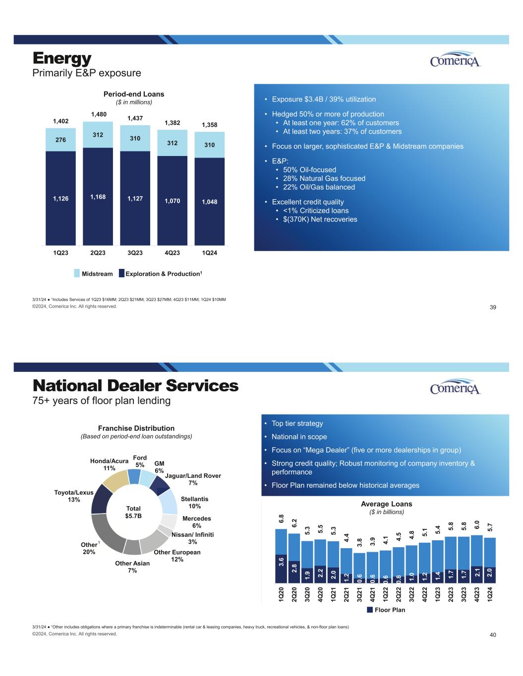 Energy Primarily E&P exposure 3/31/24 1Includes Services of 1Q23 $16MM; 2Q23 $21MM; 3Q23 $27MM; 4Q23 $11MM; 1Q24 $10MM Period-end Loans ($ in millions) 1,126 1,168 1,127 1,070 1,048 276 312 310 312 310 1,402 1,480 1,437 1,382 1,358 1Q23 2Q23 3Q23 4Q23 1Q24 Midstream Exploration & Production1 ©2024, Comerica Inc. All rights reserved. 39 • Exposure $3.4B / 39% utilization • Hedged 50% or more of production • At least one year: 62% of customers • At least two years: 37% of customers • Focus on larger, sophisticated E&P & Midstream companies • E&P: • 50% Oil-focused • 28% Natural Gas focused • 22% Oil/Gas balanced • Excellent credit quality • <1% Criticized loans • $(370K) Net recoveries Toyota/Lexus 13% Honda/Acura 11% Ford 5% GM 6% Jaguar/Land Rover 7% Stellantis 10% Mercedes 6% Nissan/ Infiniti 3% Other European 12%Other Asian 7% Other 20% National Dealer Services 75+ years of floor plan lending 3/31/24 1Other includes obligations where a primary franchise is indeterminable (rental car & leasing companies, heavy truck, recreational vehicles, & non-floor plan loans) Franchise Distribution (Based on period-end loan outstandings) • Top tier strategy • National in scope • Focus on “Mega Dealer” (five or more dealerships in group) • Strong credit quality; Robust monitoring of company inventory & performance • Floor Plan remained below historical averages 3. 6 2. 8 1. 9 2. 2 2. 0 1. 2 0. 6 0. 6 0. 6 0. 8 1. 0 1. 2 1. 4 1. 7 1. 7 2. 1 2. 0 6. 8 6. 2 5. 3 5. 5 5. 3 4. 4 3. 8 3. 9 4. 1 4. 5 4. 8 5. 1 5. 4 5. 8 5. 8 6. 0 5. 7 1Q 20 2Q 20 3Q 20 4Q 20 1Q 21 2Q 21 3Q 21 4Q 21 1Q 22 2Q 22 3Q 22 4Q 22 1Q 23 2Q 23 3Q 23 4Q 23 1Q 24 Floor Plan Average Loans ($ in billions)Total $5.7B 1 ©2024, Comerica Inc. All rights reserved. 40