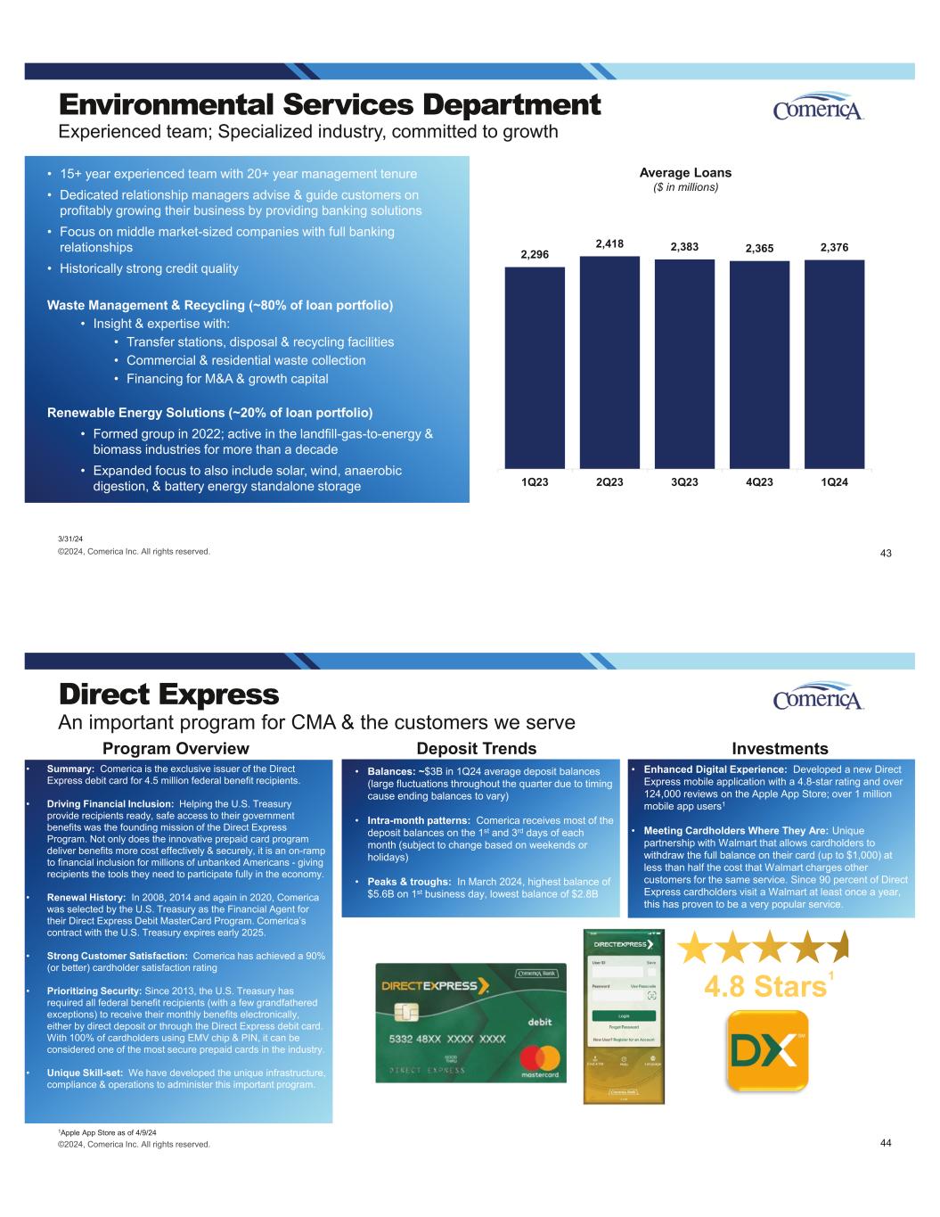 Environmental Services Department Experienced team; Specialized industry, committed to growth 3/31/24 • 15+ year experienced team with 20+ year management tenure • Dedicated relationship managers advise & guide customers on profitably growing their business by providing banking solutions • Focus on middle market-sized companies with full banking relationships • Historically strong credit quality Waste Management & Recycling (~80% of loan portfolio) • Insight & expertise with: • Transfer stations, disposal & recycling facilities • Commercial & residential waste collection • Financing for M&A & growth capital Renewable Energy Solutions (~20% of loan portfolio) • Formed group in 2022; active in the landfill-gas-to-energy & biomass industries for more than a decade • Expanded focus to also include solar, wind, anaerobic digestion, & battery energy standalone storage 2,296 2,418 2,383 2,365 2,376 1Q23 2Q23 3Q23 4Q23 1Q24 Average Loans ($ in millions) ©2024, Comerica Inc. All rights reserved. 43 ©2024, Comerica Inc. All rights reserved. Direct Express An important program for CMA & the customers we serve 1Apple App Store as of 4/9/24 • Summary: Comerica is the exclusive issuer of the Direct Express debit card for 4.5 million federal benefit recipients. • Driving Financial Inclusion: Helping the U.S. Treasury provide recipients ready, safe access to their government benefits was the founding mission of the Direct Express Program. Not only does the innovative prepaid card program deliver benefits more cost effectively & securely, it is an on-ramp to financial inclusion for millions of unbanked Americans - giving recipients the tools they need to participate fully in the economy. • Renewal History: In 2008, 2014 and again in 2020, Comerica was selected by the U.S. Treasury as the Financial Agent for their Direct Express Debit MasterCard Program. Comerica’s contract with the U.S. Treasury expires early 2025. • Strong Customer Satisfaction: Comerica has achieved a 90% (or better) cardholder satisfaction rating • Prioritizing Security: Since 2013, the U.S. Treasury has required all federal benefit recipients (with a few grandfathered exceptions) to receive their monthly benefits electronically, either by direct deposit or through the Direct Express debit card. With 100% of cardholders using EMV chip & PIN, it can be considered one of the most secure prepaid cards in the industry. • Unique Skill-set: We have developed the unique infrastructure, compliance & operations to administer this important program. Program Overview Deposit Trends Investments • Balances: ~$3B in 1Q24 average deposit balances (large fluctuations throughout the quarter due to timing cause ending balances to vary) • Intra-month patterns: Comerica receives most of the deposit balances on the 1st and 3rd days of each month (subject to change based on weekends or holidays) • Peaks & troughs: In March 2024, highest balance of $5.6B on 1st business day, lowest balance of $2.8B • Enhanced Digital Experience: Developed a new Direct Express mobile application with a 4.8-star rating and over 124,000 reviews on the Apple App Store; over 1 million mobile app users1 • Meeting Cardholders Where They Are: Unique partnership with Walmart that allows cardholders to withdraw the full balance on their card (up to $1,000) at less than half the cost that Walmart charges other customers for the same service. Since 90 percent of Direct Express cardholders visit a Walmart at least once a year, this has proven to be a very popular service. 4.8 Stars1 44