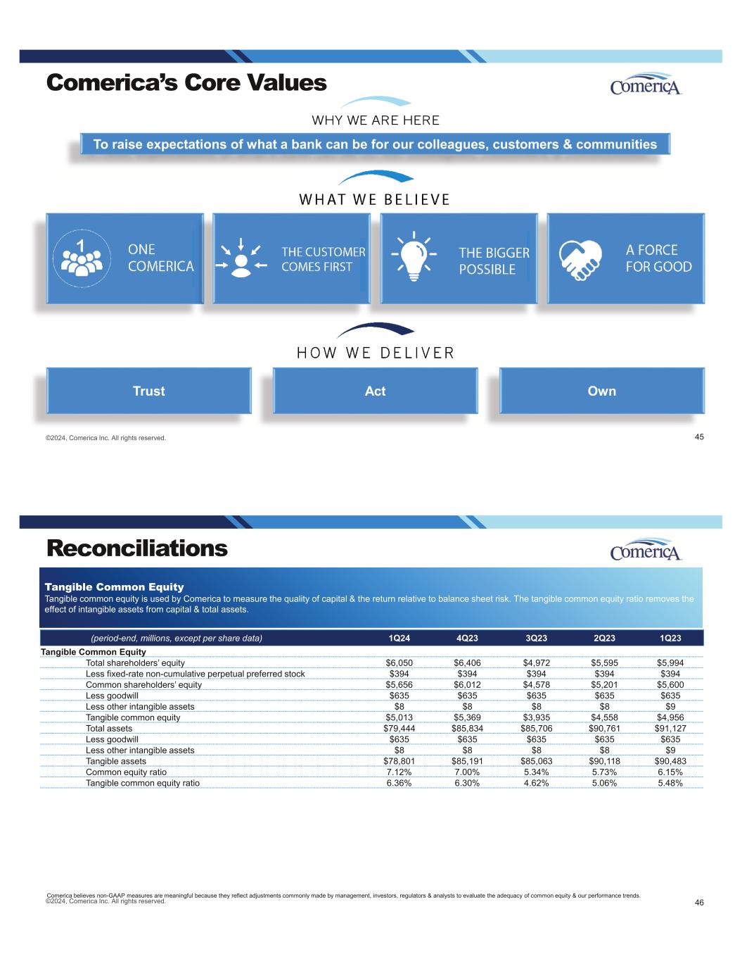 ©2024, Comerica Inc. All rights reserved. Comerica’s Core Values Trust OwnAct To raise expectations of what a bank can be for our colleagues, customers & communities 45 Reconciliations ©2024, Comerica Inc. All rights reserved. 46 (period-end, millions, except per share data) 1Q24 4Q23 3Q23 2Q23 1Q23 Tangible Common Equity Total shareholders’ equity $6,050 $6,406 $4,972 $5,595 $5,994 Less fixed-rate non-cumulative perpetual preferred stock $394 $394 $394 $394 $394 Common shareholders’ equity $5,656 $6,012 $4,578 $5,201 $5,600 Less goodwill $635 $635 $635 $635 $635 Less other intangible assets $8 $8 $8 $8 $9 Tangible common equity $5,013 $5,369 $3,935 $4,558 $4,956 Total assets $79,444 $85,834 $85,706 $90,761 $91,127 Less goodwill $635 $635 $635 $635 $635 Less other intangible assets $8 $8 $8 $8 $9 Tangible assets $78,801 $85,191 $85,063 $90,118 $90,483 Common equity ratio 7.12% 7.00% 5.34% 5.73% 6.15% Tangible common equity ratio 6.36% 6.30% 4.62% 5.06% 5.48% Tangible Common Equity Tangible common equity is used by Comerica to measure the quality of capital & the return relative to balance sheet risk. The tangible common equity ratio removes the effect of intangible assets from capital & total assets. Comerica believes non-GAAP measures are meaningful because they reflect adjustments commonly made by management, investors, regulators & analysts to evaluate the adequacy of common equity & our performance trends.