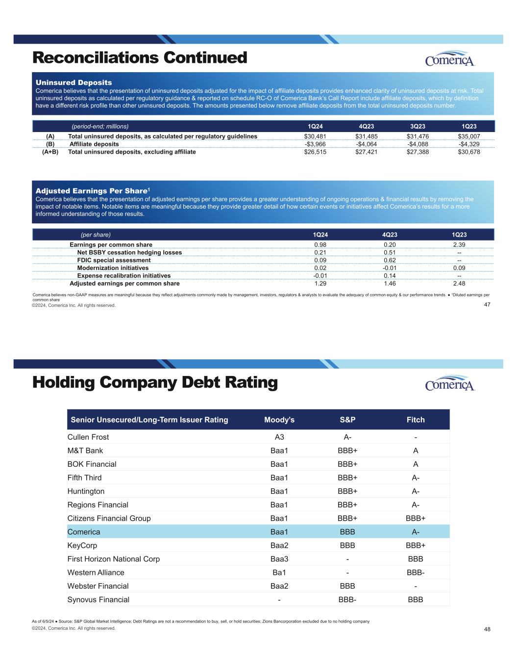 ©2024, Comerica Inc. All rights reserved. Uninsured Deposits Comerica believes that the presentation of uninsured deposits adjusted for the impact of affiliate deposits provides enhanced clarity of uninsured deposits at risk. Total uninsured deposits as calculated per regulatory guidance & reported on schedule RC-O of Comerica Bank’s Call Report include affiliate deposits, which by definition have a different risk profile than other uninsured deposits. The amounts presented below remove affiliate deposits from the total uninsured deposits number. Reconciliations Continued Comerica believes non-GAAP measures are meaningful because they reflect adjustments commonly made by management, investors, regulators & analysts to evaluate the adequacy of common equity & our performance trends. 1Diluted earnings per common share (period-end; millions) 1Q24 4Q23 3Q23 1Q23 (A) Total uninsured deposits, as calculated per regulatory guidelines $30,481 $31,485 $31,476 $35,007 (B) Affiliate deposits -$3,966 -$4,064 -$4,088 -$4,329 (A+B) Total uninsured deposits, excluding affiliate $26,515 $27,421 $27,388 $30,678 47 Adjusted Earnings Per Share1 Comerica believes that the presentation of adjusted earnings per share provides a greater understanding of ongoing operations & financial results by removing the impact of notable items. Notable items are meaningful because they provide greater detail of how certain events or initiatives affect Comerica’s results for a more informed understanding of those results. (per share) 1Q24 4Q23 1Q23 Earnings per common share 0.98 0.20 2.39 Net BSBY cessation hedging losses 0.21 0.51 -- FDIC special assessment 0.09 0.62 -- Modernization initiatives 0.02 -0.01 0.09 Expense recalibration initiatives -0.01 0.14 -- Adjusted earnings per common share 1.29 1.46 2.48 Holding Company Debt Rating As of 6/5/24 Source: S&P Global Market Intelligence; Debt Ratings are not a recommendation to buy, sell, or hold securities; Zions Bancorporation excluded due to no holding company Senior Unsecured/Long-Term Issuer Rating Moody’s S&P Fitch Cullen Frost A3 A- - M&T Bank Baa1 BBB+ A BOK Financial Baa1 BBB+ A Fifth Third Baa1 BBB+ A- Huntington Baa1 BBB+ A- Regions Financial Baa1 BBB+ A- Citizens Financial Group Baa1 BBB+ BBB+ Comerica Baa1 BBB A- KeyCorp Baa2 BBB BBB+ First Horizon National Corp Baa3 - BBB Western Alliance Ba1 - BBB- Webster Financial Baa2 BBB - Synovus Financial - BBB- BBB ©2024, Comerica Inc. All rights reserved. 48