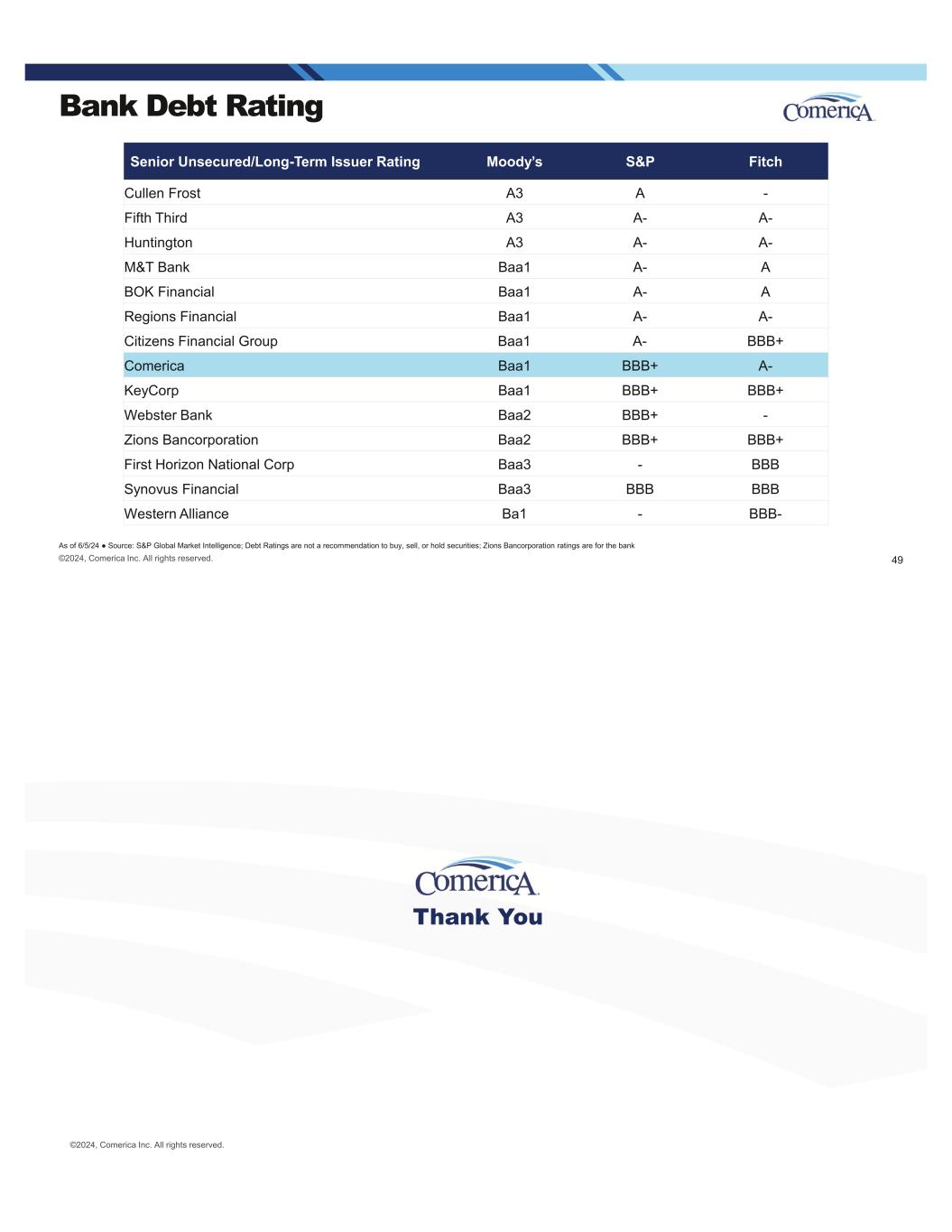 Bank Debt Rating As of 6/5/24 Source: S&P Global Market Intelligence; Debt Ratings are not a recommendation to buy, sell, or hold securities; Zions Bancorporation ratings are for the bank Senior Unsecured/Long-Term Issuer Rating Moody’s S&P Fitch Cullen Frost A3 A - Fifth Third A3 A- A- Huntington A3 A- A- M&T Bank Baa1 A- A BOK Financial Baa1 A- A Regions Financial Baa1 A- A- Citizens Financial Group Baa1 A- BBB+ Comerica Baa1 BBB+ A- KeyCorp Baa1 BBB+ BBB+ Webster Bank Baa2 BBB+ - Zions Bancorporation Baa2 BBB+ BBB+ First Horizon National Corp Baa3 - BBB Synovus Financial Baa3 BBB BBB Western Alliance Ba1 - BBB- ©2024, Comerica Inc. All rights reserved. 49 Thank You ©2024, Comerica Inc. All rights reserved.