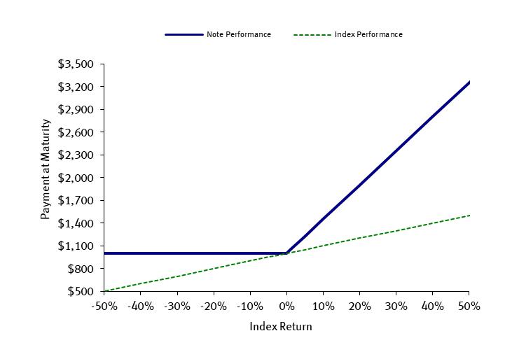 If the Final Value is greater than the Initial Value, investors will receive at maturity the $1,000 principal amount plus the Additional Amount, which is equal to $1,000 times the Index Return times the Participation Rate of at least 450.00%.