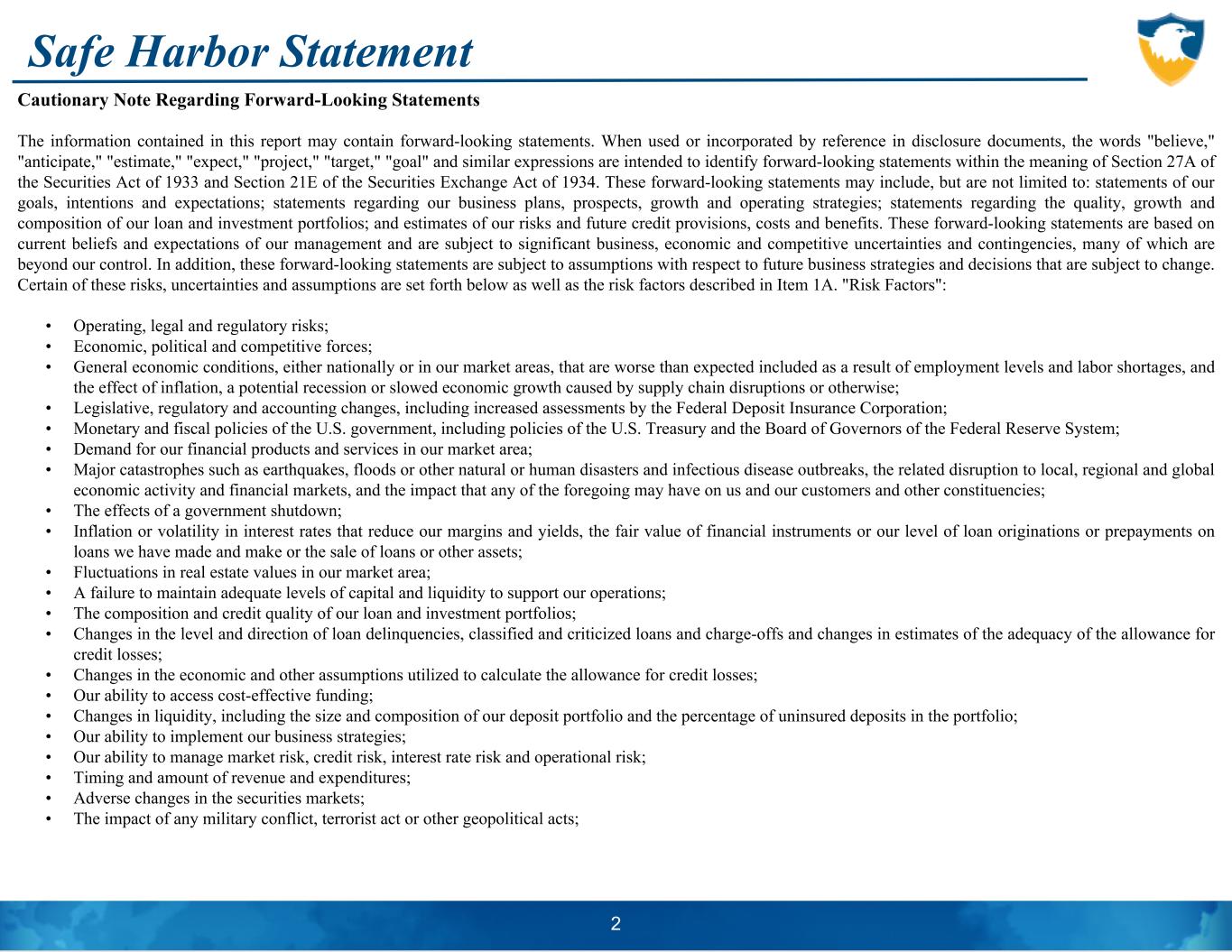Safe Harbor Statement Cautionary Note Regarding Forward-Looking Statements The information contained in this report may contain forward-looking statements. When used or incorporated by reference in disclosure documents, the words "believe," "anticipate," "estimate," "expect," "project," "target," "goal" and similar expressions are intended to identify forward-looking statements within the meaning of Section 27A of the Securities Act of 1933 and Section 21E of the Securities Exchange Act of 1934. These forward-looking statements may include, but are not limited to: statements of our goals, intentions and expectations; statements regarding our business plans, prospects, growth and operating strategies; statements regarding the quality, growth and composition of our loan and investment portfolios; and estimates of our risks and future credit provisions, costs and benefits. These forward-looking statements are based on current beliefs and expectations of our management and are subject to significant business, economic and competitive uncertainties and contingencies, many of which are beyond our control. In addition, these forward-looking statements are subject to assumptions with respect to future business strategies and decisions that are subject to change. Certain of these risks, uncertainties and assumptions are set forth below as well as the risk factors described in Item 1A. "Risk Factors": • Operating, legal and regulatory risks; • Economic, political and competitive forces; • General economic conditions, either nationally or in our market areas, that are worse than expected included as a result of employment levels and labor shortages, and the effect of inflation, a potential recession or slowed economic growth caused by supply chain disruptions or otherwise; • Legislative, regulatory and accounting changes, including increased assessments by the Federal Deposit Insurance Corporation; • Monetary and fiscal policies of the U.S. government, including policies of the U.S. Treasury and the Board of Governors of the Federal Reserve System; • Demand for our financial products and services in our market area; • Major catastrophes such as earthquakes, floods or other natural or human disasters and infectious disease outbreaks, the related disruption to local, regional and global economic activity and financial markets, and the impact that any of the foregoing may have on us and our customers and other constituencies; • The effects of a government shutdown; • Inflation or volatility in interest rates that reduce our margins and yields, the fair value of financial instruments or our level of loan originations or prepayments on loans we have made and make or the sale of loans or other assets; • Fluctuations in real estate values in our market area; • A failure to maintain adequate levels of capital and liquidity to support our operations; • The composition and credit quality of our loan and investment portfolios; • Changes in the level and direction of loan delinquencies, classified and criticized loans and charge-offs and changes in estimates of the adequacy of the allowance for credit losses; • Changes in the economic and other assumptions utilized to calculate the allowance for credit losses; • Our ability to access cost-effective funding; • Changes in liquidity, including the size and composition of our deposit portfolio and the percentage of uninsured deposits in the portfolio; • Our ability to implement our business strategies; • Our ability to manage market risk, credit risk, interest rate risk and operational risk; • Timing and amount of revenue and expenditures; • Adverse changes in the securities markets; • The impact of any military conflict, terrorist act or other geopolitical acts; 2