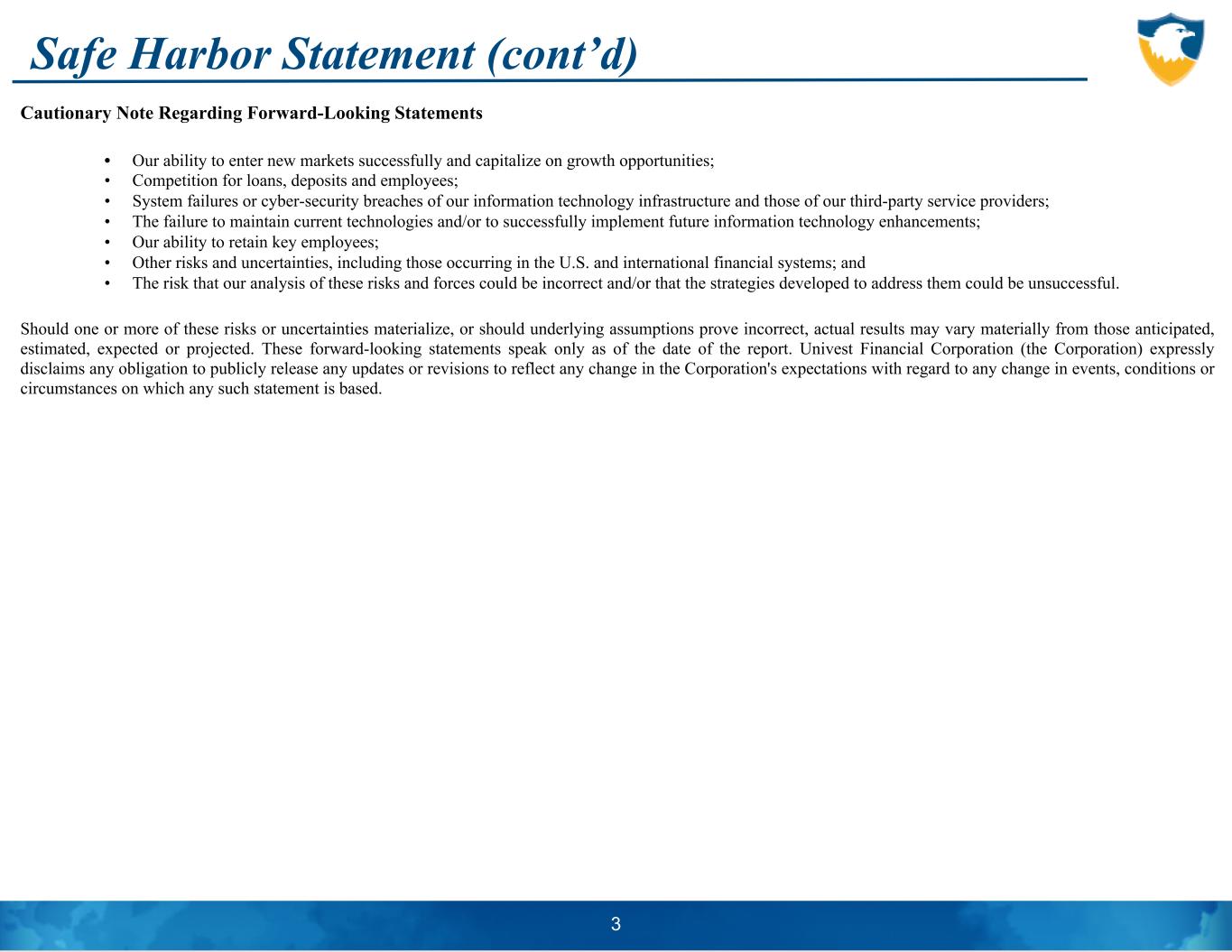 Safe Harbor Statement (cont’d) Cautionary Note Regarding Forward-Looking Statements • Our ability to enter new markets successfully and capitalize on growth opportunities; • Competition for loans, deposits and employees; • System failures or cyber-security breaches of our information technology infrastructure and those of our third-party service providers; • The failure to maintain current technologies and/or to successfully implement future information technology enhancements; • Our ability to retain key employees; • Other risks and uncertainties, including those occurring in the U.S. and international financial systems; and • The risk that our analysis of these risks and forces could be incorrect and/or that the strategies developed to address them could be unsuccessful. Should one or more of these risks or uncertainties materialize, or should underlying assumptions prove incorrect, actual results may vary materially from those anticipated, estimated, expected or projected. These forward-looking statements speak only as of the date of the report. Univest Financial Corporation (the Corporation) expressly disclaims any obligation to publicly release any updates or revisions to reflect any change in the Corporation's expectations with regard to any change in events, conditions or circumstances on which any such statement is based. 3