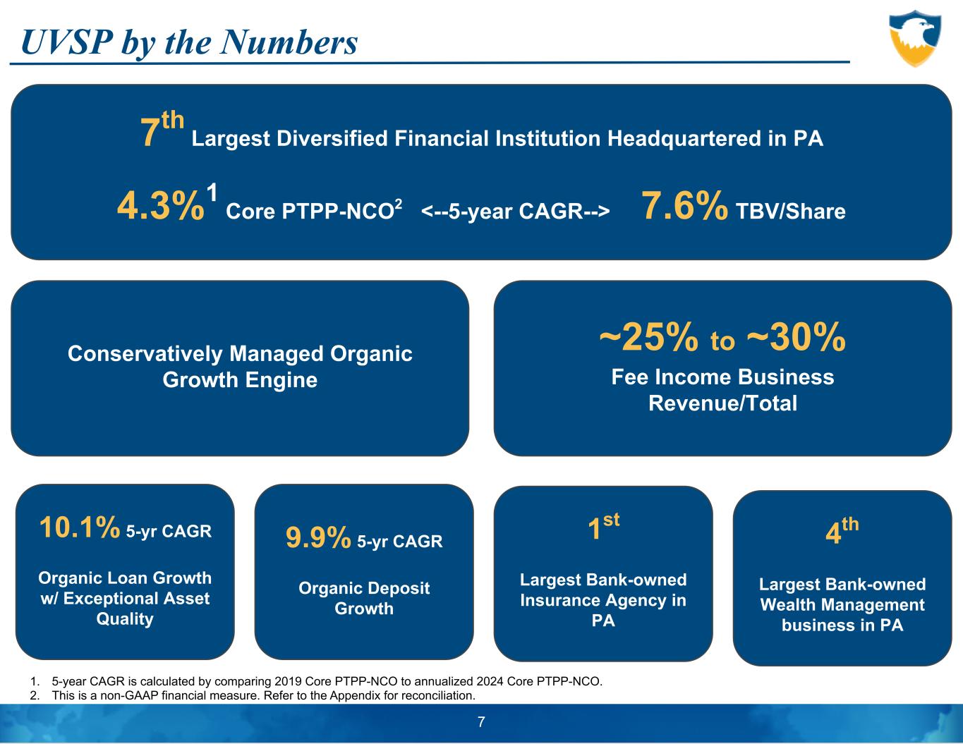 Univest Company Overview • Headquartered in Souderton, Pennsylvania (Montgomery County) • Bank founded in 1876, holding company formed in 1973 • Engaged in financial services business, providing full range of banking, insurance and wealth management services ◦ Comprehensive financial solutions delivered locally • Experienced management team with proven performance track record • Primarily serving thirteen counties in the Southeastern and Central regions of Pennsylvania, six counties in Western Pennsylvania, three counties in Southern New Jersey and four counties in Maryland • Operating leverage and scale with $7.7 billion of assets, $5.0 billion of assets under management and supervision and agent for $213 million of underwritten insurance premiums as of 3/31/24 6