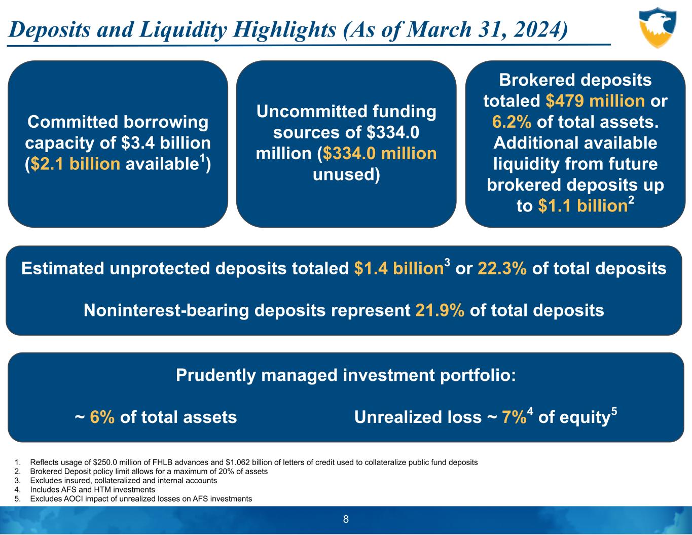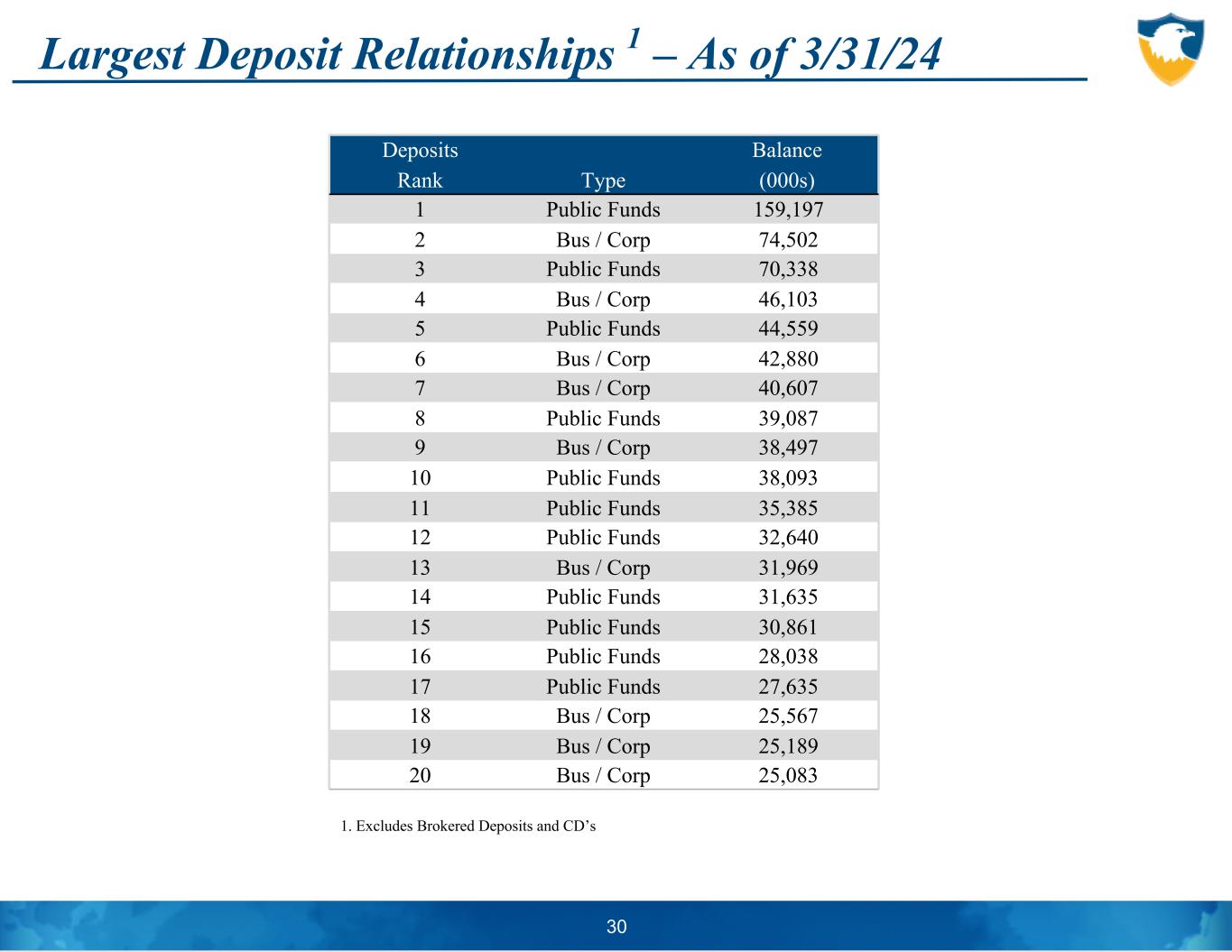 Largest Deposit Relationships 1 – As of 3/31/24 30 Deposits Balance Rank Type (000s) 1 Public Funds 159,197 2 Bus / Corp 74,502 3 Public Funds 70,338 4 Bus / Corp 46,103 5 Public Funds 44,559 6 Bus / Corp 42,880 7 Bus / Corp 40,607 8 Public Funds 39,087 9 Bus / Corp 38,497 10 Public Funds 38,093 11 Public Funds 35,385 12 Public Funds 32,640 13 Bus / Corp 31,969 14 Public Funds 31,635 15 Public Funds 30,861 16 Public Funds 28,038 17 Public Funds 27,635 18 Bus / Corp 25,567 19 Bus / Corp 25,189 20 Bus / Corp 25,083 1. Excludes Brokered Deposits and CD’s