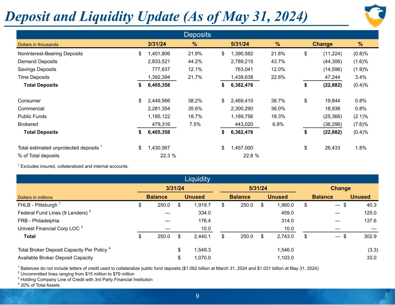 Deposit and Liquidity Update (As of May 31, 2024) 9 Deposits Dollars in thousands 3/31/24 % 5/31/24 % Change % Noninterest-Bearing Deposits $ 1,401,806 21.9% $ 1,390,582 21.8% $ (11,224) (0.8)% Demand Deposits 2,833,521 44.2% 2,789,215 43.7% (44,306) (1.6)% Savings Deposits 777,637 12.1% 763,041 12.0% (14,596) (1.9)% Time Deposits 1,392,394 21.7% 1,439,638 22.6% 47,244 3.4% Total Deposits $ 6,405,358 $ 6,382,476 $ (22,882) (0.4)% Consumer $ 2,449,566 38.2% $ 2,469,410 38.7% $ 19,844 0.8% Commercial 2,281,354 35.6% 2,300,290 36.0% 18,936 0.8% Public Funds 1,195,122 18.7% 1,169,756 18.3% (25,366) (2.1)% Brokered 479,316 7.5% 443,020 6.9% (36,296) (7.6)% Total Deposits $ 6,405,358 $ 6,382,476 $ (22,882) (0.4)% Total estimated unprotected deposits 1 $ 1,430,567 $ 1,457,000 $ 26,433 1.8% % of Total deposits 22.3 % 22.8 % 1 Excludes insured, collateralized and internal accounts. Liquidity 3/31/24 5/31/24 Change Dollars in millions Balance Unused Balance Unused Balance Unused FHLB - Pittsburgh 1 $ 250.0 $ 1,919.7 $ 250.0 $ 1,960.0 $ — $ 40.3 Federal Fund Lines (9 Lenders) 2 — 334.0 459.0 — 125.0 FRB - Philadelphia — 176.4 314.0 — 137.6 Univest Financial Corp LOC 3 — 10.0 10.0 — — Total $ 250.0 $ 2,440.1 $ 250.0 $ 2,743.0 $ — $ 302.9 Total Broker Deposit Capacity Per Policy 4 $ 1,549.3 1,546.0 (3.3) Available Broker Deposit Capacity $ 1,070.0 1,103.0 33.0 1 Balances do not include letters of credit used to collateralize public fund deposits ($1.062 billion at March 31, 2024 and $1.031 billion at May 31, 2024) 2 Uncommitted lines ranging from $15 million to $79 million 3 Holding Company Line of Credit with 3rd Party Financial Institution 4 20% of Total Assets