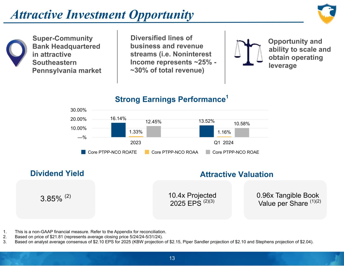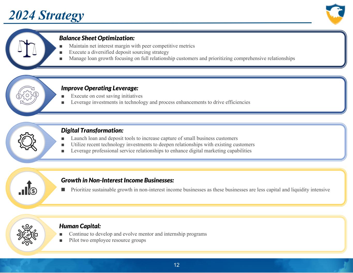 2024 Strategy 12 Growth in Non-Interest Income Businesses: ■ Prioritize sustainable growth in non-interest income businesses as these businesses are less capital and liquidity intensive Improve Operating Leverage: ■ Execute on cost saving initiatives ■ Leverage investments in technology and process enhancements to drive efficiencies Balance Sheet Optimization: ■ Maintain net interest margin with peer competitive metrics ■ Execute a diversified deposit sourcing strategy ■ Manage loan growth focusing on full relationship customers and prioritizing comprehensive relationships Digital Transformation: ■ Launch loan and deposit tools to increase capture of small business customers ■ Utilize recent technology investments to deepen relationships with existing customers ■ Leverage professional service relationships to enhance digital marketing capabilities Human Capital: ■ Continue to develop and evolve mentor and internship programs ■ Pilot two employee resource groups