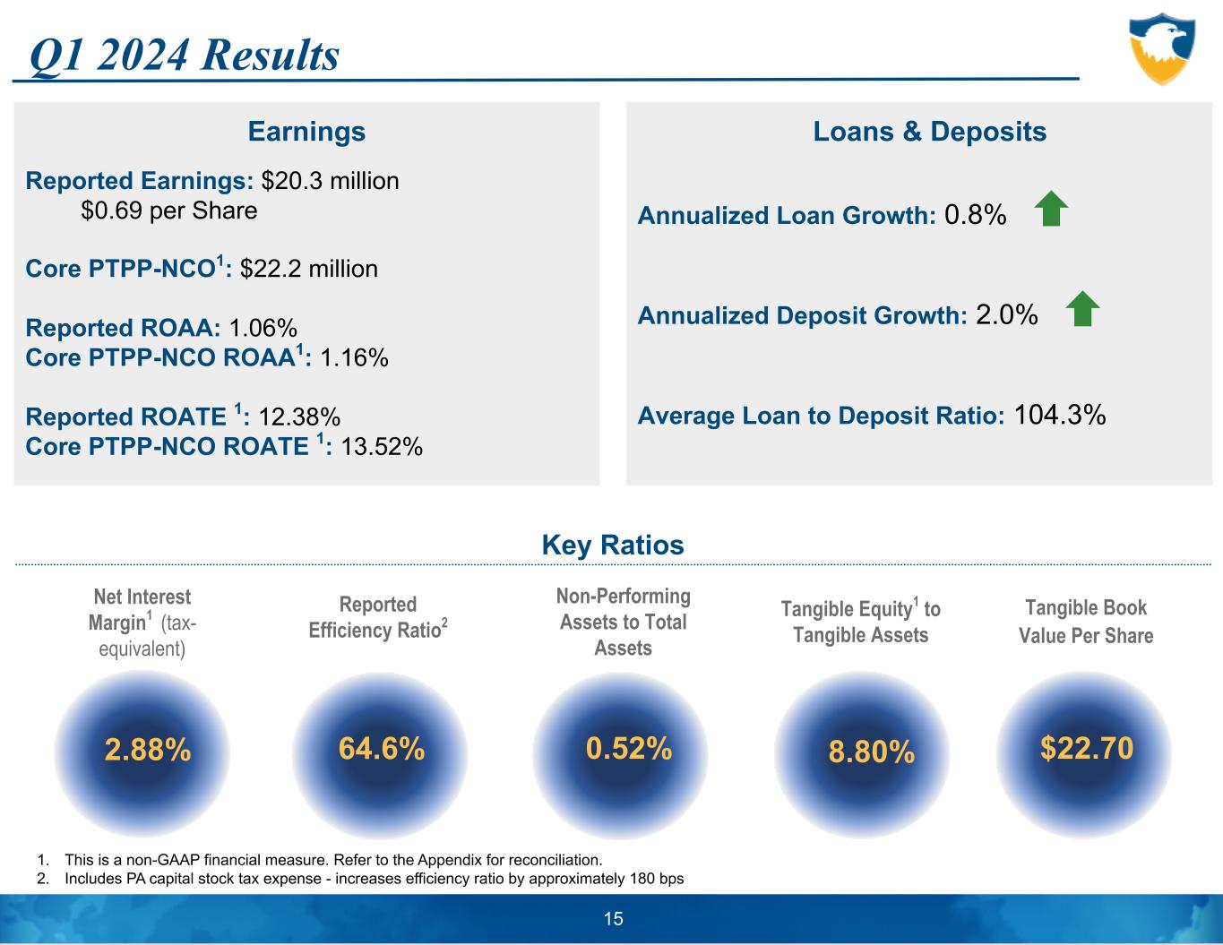 Q1 2024 Results 1. This is a non-GAAP financial measure. Refer to the Appendix for reconciliation. 2. Includes PA capital stock tax expense - increases efficiency ratio by approximately 180 bps 15 Earnings Loans & Deposits Key Ratios Reported Earnings: $20.3 million $0.69 per Share Core PTPP-NCO1: $22.2 million Reported ROAA: 1.06% Core PTPP-NCO ROAA1: 1.16% Reported ROATE 1: 12.38% Core PTPP-NCO ROATE 1: 13.52% Annualized Loan Growth: 0.8% Annualized Deposit Growth: 2.0% Average Loan to Deposit Ratio: 104.3% Net Interest Margin1 (tax- equivalent) Reported Efficiency Ratio2 Non-Performing Assets to Total Assets Tangible Equity1 to Tangible Assets Tangible Book Value Per Share 2.88% 64.6% 0.52% 8.80% $22.70
