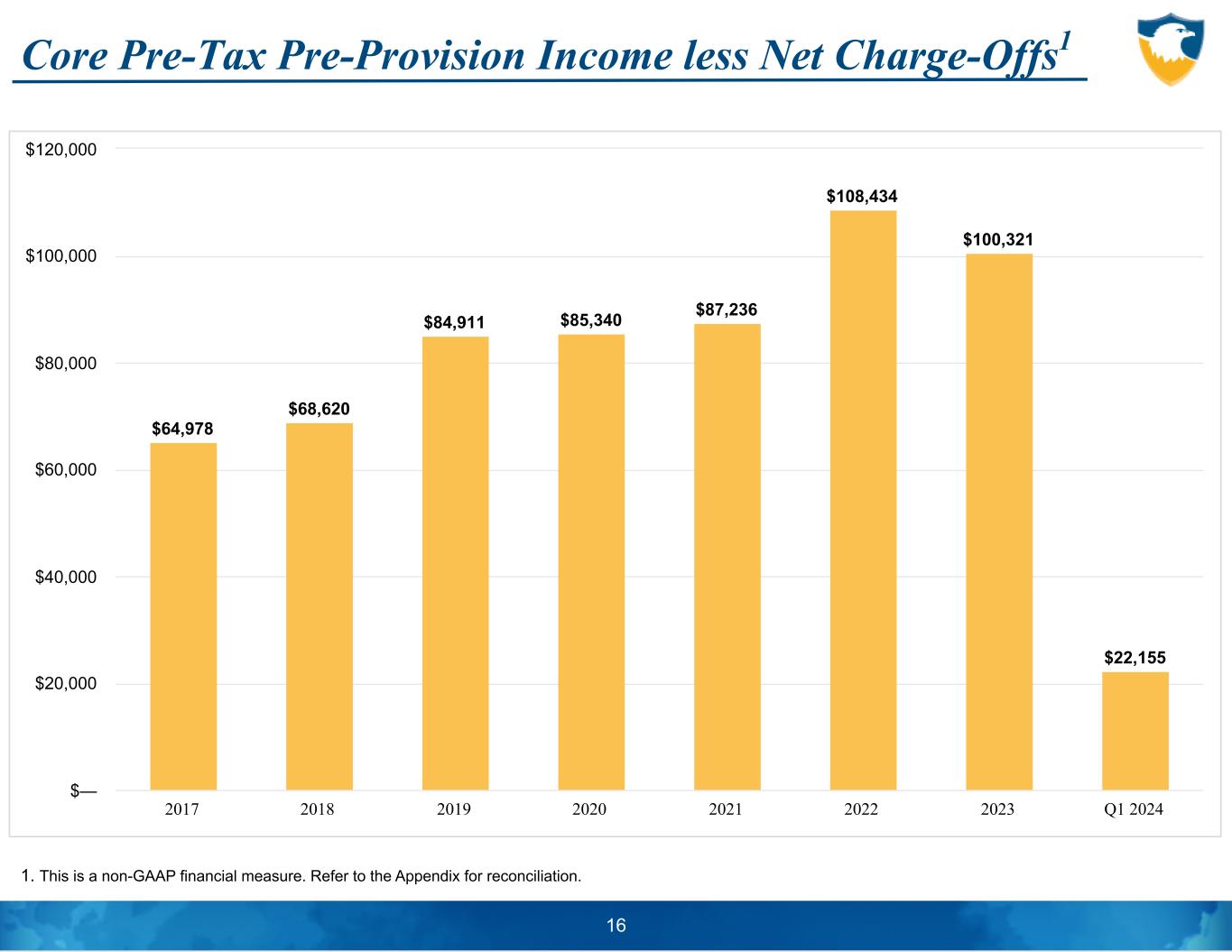 $64,978 $68,620 $84,911 $85,340 $87,236 $108,434 $100,321 $22,155 2017 2018 2019 2020 2021 2022 2023 Q1 2024 $— $20,000 $40,000 $60,000 $80,000 $100,000 $120,000 Core Pre-Tax Pre-Provision Income less Net Charge-Offs1 1. This is a non-GAAP financial measure. Refer to the Appendix for reconciliation. 16
