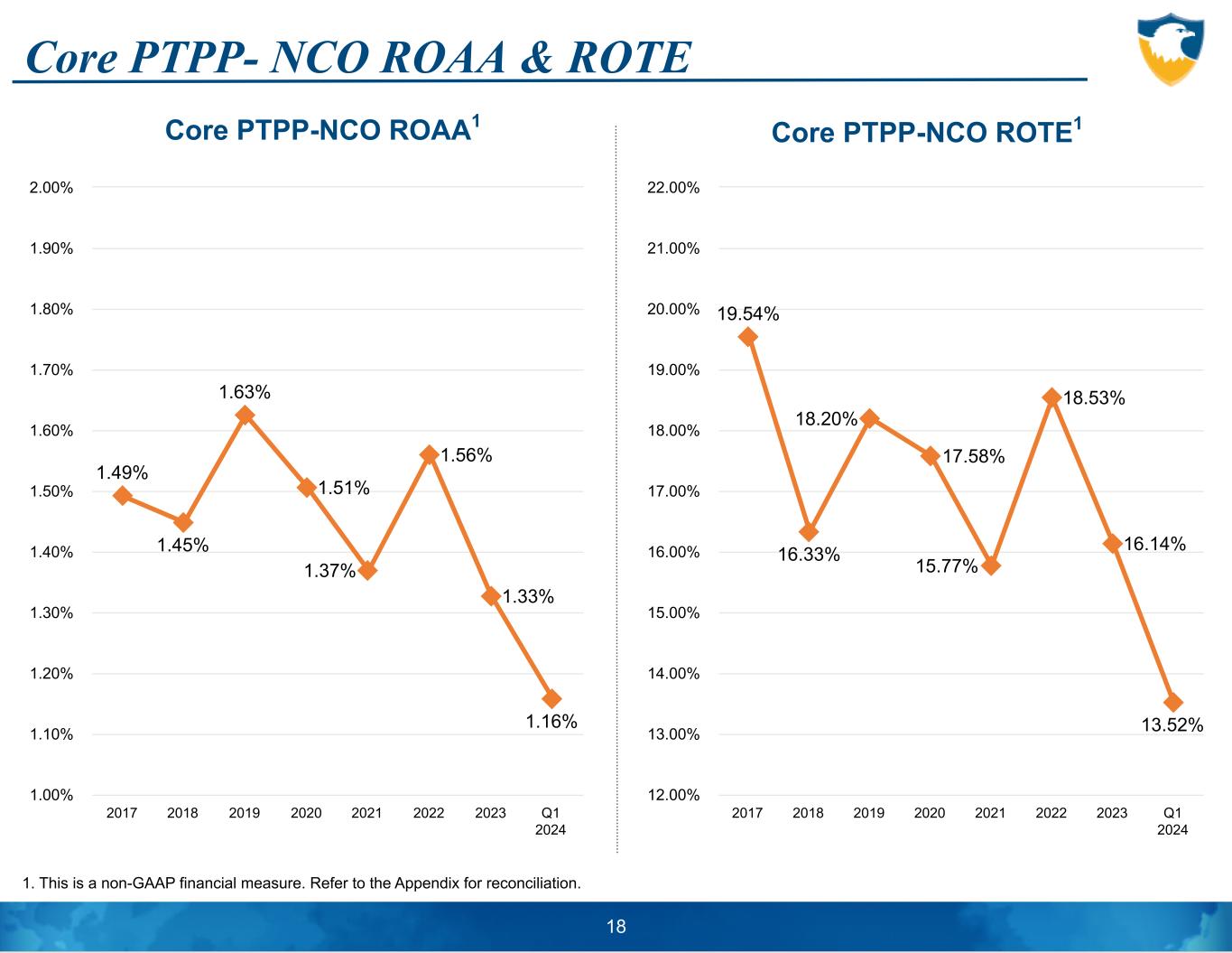 $14.44 $15.24 $17.01 $17.66 $20.14 $20.42 $22.41 $22.70 2017 2018 2019 2020 2021 2022 2023 Q1 2024 $— $5.00 $10.00 $15.00 $20.00 $25.00 Tangible Book Value Per Share1 1. This is a non-GAAP financial measure. Refer to the Appendix for reconciliation. 2. Assumes no Wealth Management or Insurance acquisitions. Target 8-10% Annual Growth 2 2017 - 2024 CAGR = 7.5% 17 12/31/23 vs 3/31/24 $22.41 $0.69 $(0.26) $(0.14) $22.70 12/31/23 Earnings Buybacks, Dividends, Other AOCI 3/31/2024 $— $5.00 $10.00 $15.00 $20.00 $25.00 $30.00 1 12/31/22 vs 3/31/24 $20.42 $3.12 $(1.09) $0.25 $22.70 12/31/22 Earnings Buybacks, Dividends, Other AOCI 3/31/2024 $— $5.00 $10.00 $15.00 $20.00 $25.00 $30.00