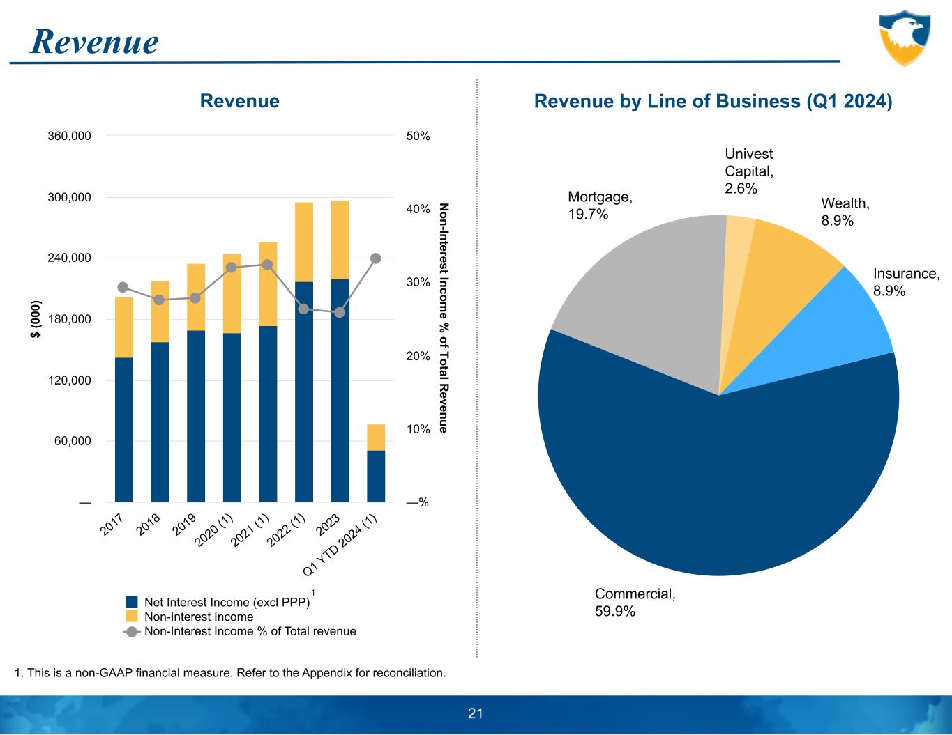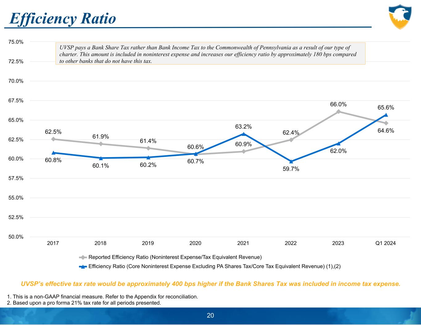 62.5% 61.9% 61.4% 60.6% 60.9% 62.4% 66.0% 64.6% 60.8% 60.1% 60.2% 60.7% 63.2% 59.7% 62.0% 65.6% Reported Efficiency Ratio (Noninterest Expense/Tax Equivalent Revenue) Efficiency Ratio (Core Noninterest Expense Excluding PA Shares Tax/Core Tax Equivalent Revenue) (1),(2) 2017 2018 2019 2020 2021 2022 2023 Q1 2024 50.0% 52.5% 55.0% 57.5% 60.0% 62.5% 65.0% 67.5% 70.0% 72.5% 75.0% Efficiency Ratio 1. This is a non-GAAP financial measure. Refer to the Appendix for reconciliation. 2. Based upon a pro forma 21% tax rate for all periods presented. UVSP’s effective tax rate would be approximately 400 bps higher if the Bank Shares Tax was included in income tax expense. 20 UVSP pays a Bank Share Tax rather than Bank Income Tax to the Commonwealth of Pennsylvania as a result of our type of charter. This amount is included in noninterest expense and increases our efficiency ratio by approximately 180 bps compared to other banks that do not have this tax. UVSP’s effective tax rate would be approximately 400 bps higher if the Bank Shares Tax was included in income tax expense.