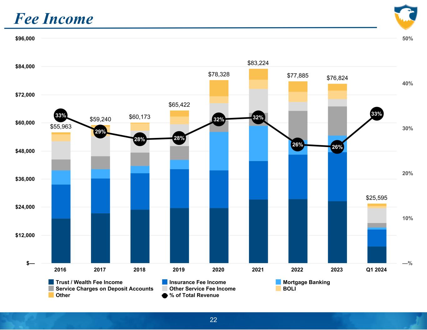 Fee Income 22 $55,963 $59,240 $60,173 $65,422 $78,328 $83,224 $77,885 $76,824 $25,595 33% 29% 28% 28% 32% 32% 26% 26% 33% Trust / Wealth Fee Income Insurance Fee Income Mortgage Banking Service Charges on Deposit Accounts Other Service Fee Income BOLI Other % of Total Revenue 2016 2017 2018 2019 2020 2021 2022 2023 Q1 2024 $— $12,000 $24,000 $36,000 $48,000 $60,000 $72,000 $84,000 $96,000 —% 10% 20% 30% 40% 50%