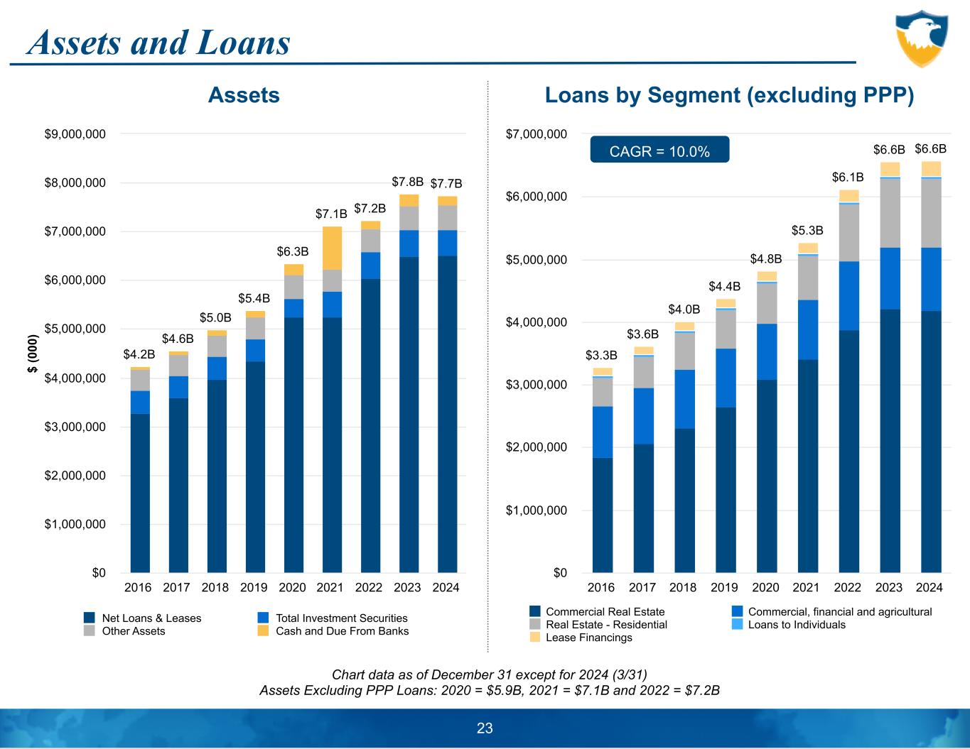 Assets and Loans Chart data as of December 31 except for 2024 (3/31) Assets Excluding PPP Loans: 2020 = $5.9B, 2021 = $7.1B and 2022 = $7.2B $ (0 00 ) $4.2B $4.6B $5.0B $5.4B $6.3B $7.1B $7.2B $7.8B $7.7B Net Loans & Leases Total Investment Securities Other Assets Cash and Due From Banks 2016 2017 2018 2019 2020 2021 2022 2023 2024 $0 $1,000,000 $2,000,000 $3,000,000 $4,000,000 $5,000,000 $6,000,000 $7,000,000 $8,000,000 $9,000,000 23 Assets Loans by Segment (excluding PPP) $3.3B $3.6B $4.0B $4.4B $4.8B $5.3B $6.1B $6.6B $6.6B Commercial Real Estate Commercial, financial and agricultural Real Estate - Residential Loans to Individuals Lease Financings 2016 2017 2018 2019 2020 2021 2022 2023 2024 $0 $1,000,000 $2,000,000 $3,000,000 $4,000,000 $5,000,000 $6,000,000 $7,000,000 CAGR = 10.0%
