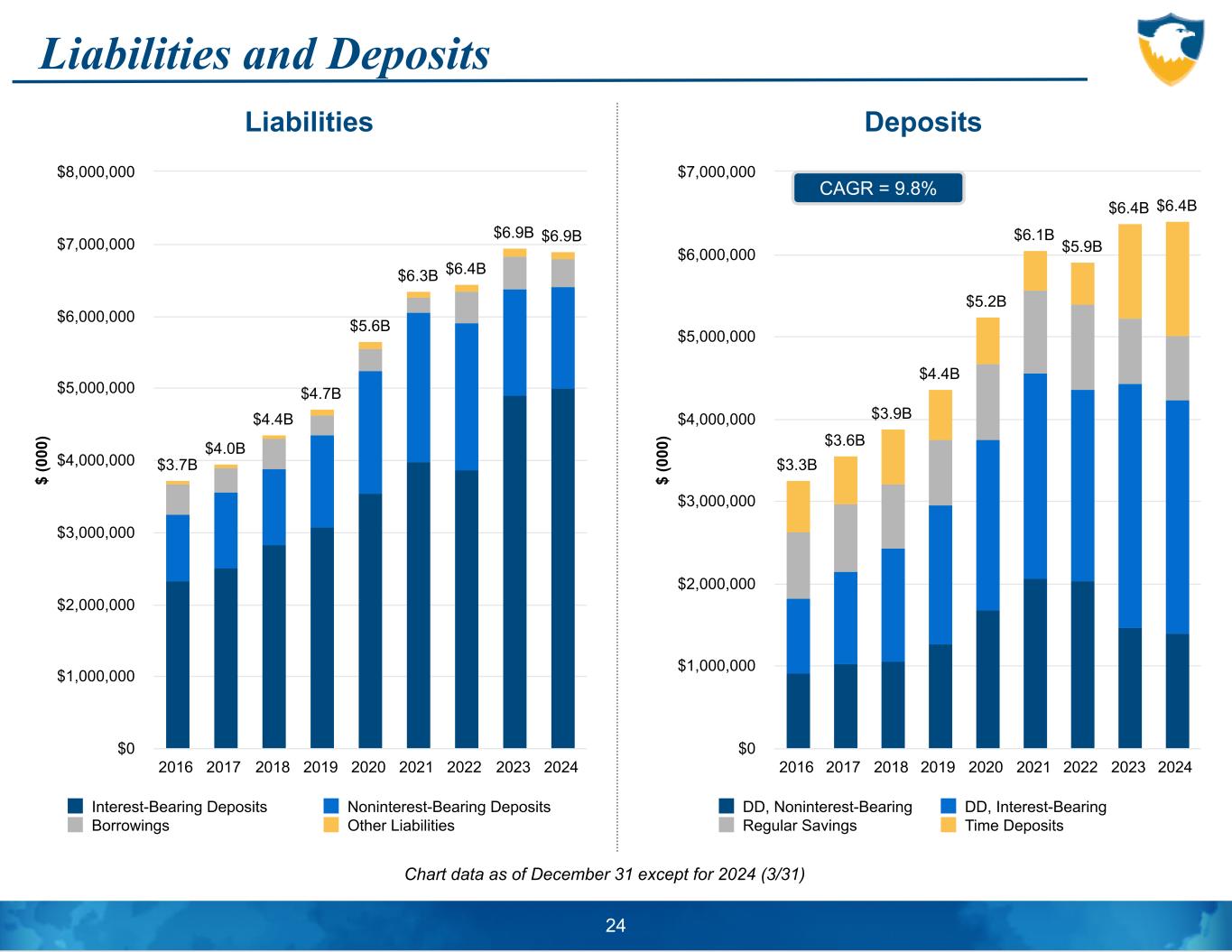 Liabilities and Deposits Chart data as of December 31 except for 2024 (3/31) $ (0 00 ) $3.7B $4.0B $4.4B $4.7B $5.6B $6.3B $6.4B $6.9B $6.9B Interest-Bearing Deposits Noninterest-Bearing Deposits Borrowings Other Liabilities 2016 2017 2018 2019 2020 2021 2022 2023 2024 $0 $1,000,000 $2,000,000 $3,000,000 $4,000,000 $5,000,000 $6,000,000 $7,000,000 $8,000,000 $ (0 00 ) $3.3B $3.6B $3.9B $4.4B $5.2B $6.1B $5.9B $6.4B $6.4B DD, Noninterest-Bearing DD, Interest-Bearing Regular Savings Time Deposits 2016 2017 2018 2019 2020 2021 2022 2023 2024 $0 $1,000,000 $2,000,000 $3,000,000 $4,000,000 $5,000,000 $6,000,000 $7,000,000 24 CAGR = 9.8% Liabilities Deposits