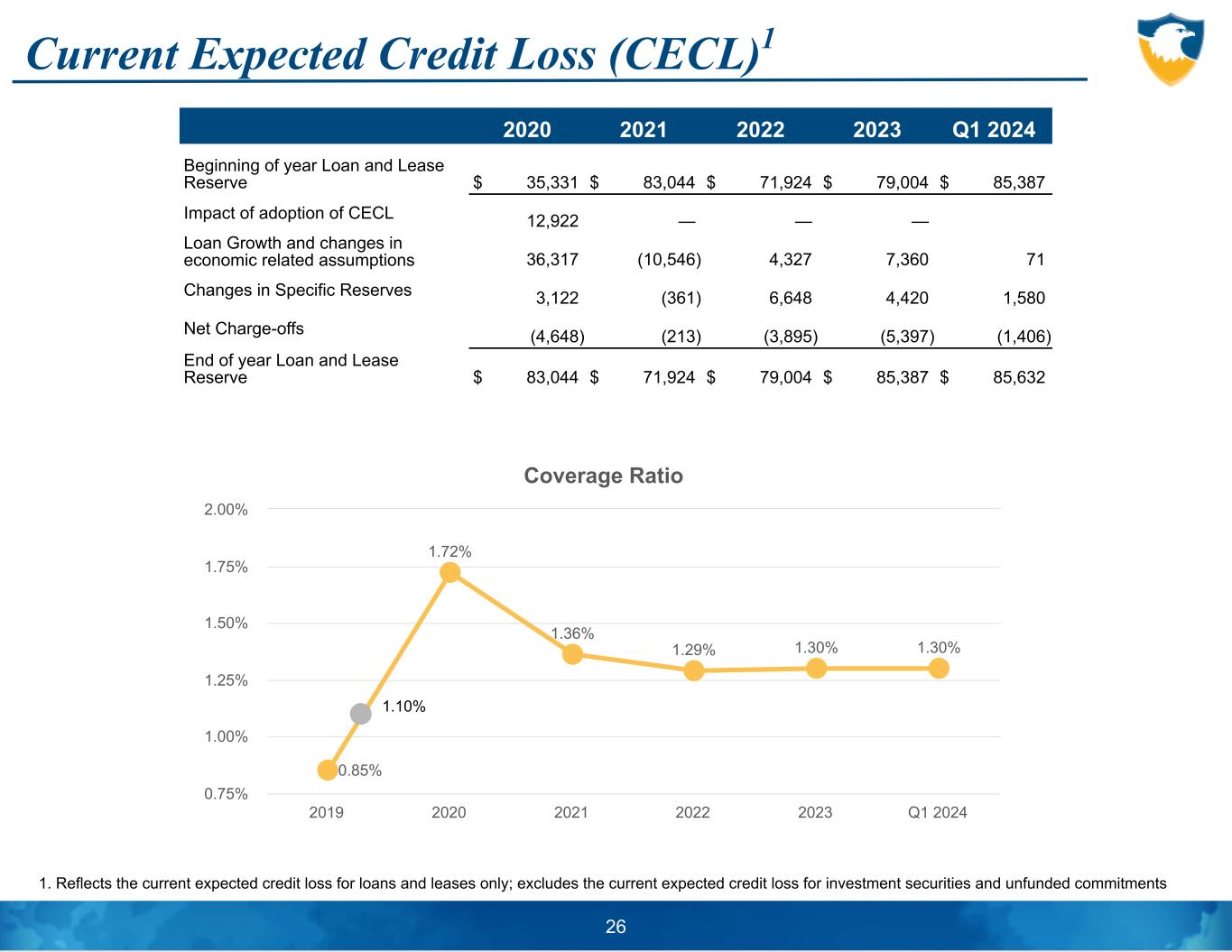 Stable Asset Quality Chart data as of December 31 except for 2024 (3/31) $ (0 00 ) Nonaccrual Loans and Leases ACL/nonaccrual loans and leases 2016 2017 2018 2019 2020 2021 2022 2023 2024 $— $10,000 $20,000 $30,000 $40,000 $50,000 0.0% 100.0% 200.0% 300.0% 400.0% 500.0% 600.0% 700.0% $ (0 00 ) Nonaccrual & 90+ Past Due Loans and Leases Troubled Debt Restructured Loans and Leases Other Real Estate Owned Repossessed Assets Nonperforming Assets to Total Assets Ratio of Net Charge-offs to Avg Loans and Leases 2016 2017 2018 2019 2020 2021 2022 2023 2024 $— $10,000 $20,000 $30,000 $40,000 $50,000 (0.25)% —% 0.25% 0.50% 0.75% 1.00% 1.25% 1.50% 1.75% 2.00% 2.25% 2.50% 25 Nonperforming Assets Nonaccrual Loans & Leases