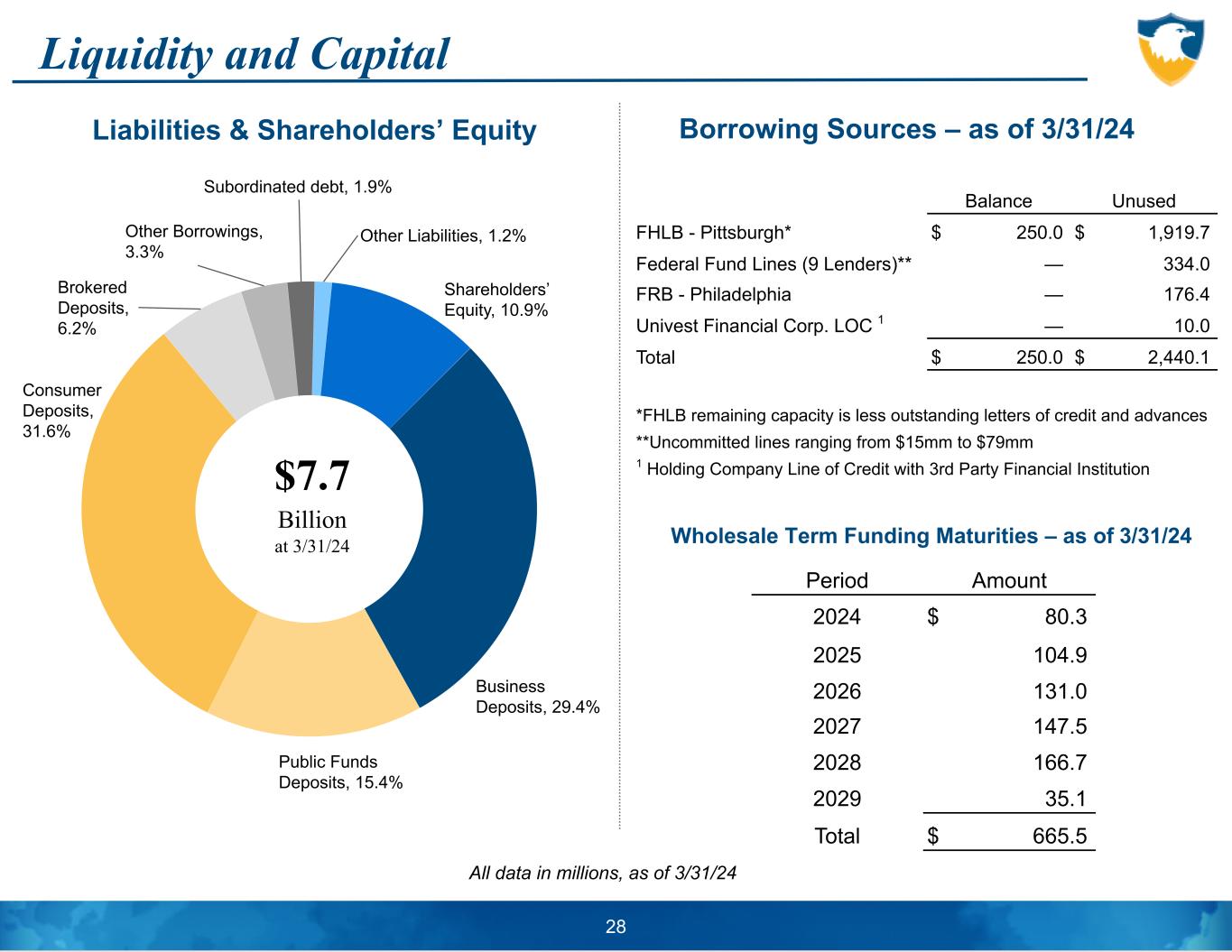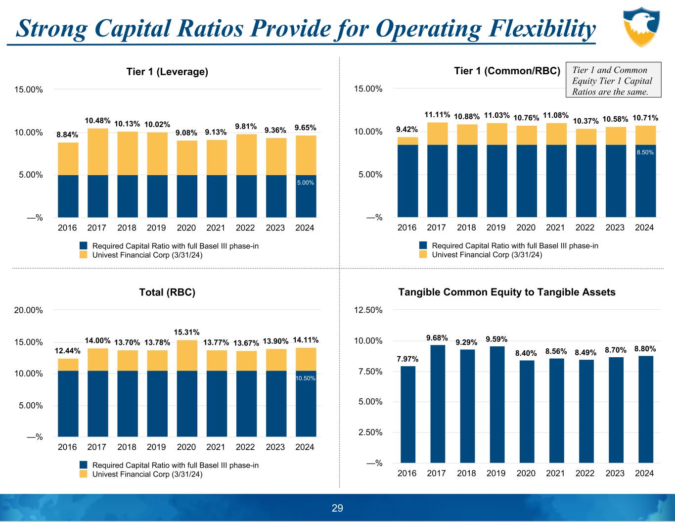 Liquidity and Capital All data in millions, as of 3/31/24 Balance Unused FHLB - Pittsburgh* $ 250.0 $ 1,919.7 Federal Fund Lines (9 Lenders)** — 334.0 FRB - Philadelphia — 176.4 Univest Financial Corp. LOC 1 — 10.0 Total $ 250.0 $ 2,440.1 *FHLB remaining capacity is less outstanding letters of credit and advances **Uncommitted lines ranging from $15mm to $79mm 1 Holding Company Line of Credit with 3rd Party Financial Institution Period Amount 2024 $ 80.3 2025 104.9 2026 131.0 2027 147.5 2028 166.7 2029 35.1 Total $ 665.5 28 Liabilities & Shareholders’ Equity Borrowing Sources – as of 3/31/24 Wholesale Term Funding Maturities – as of 3/31/24 Business Deposits, 29.4% Public Funds Deposits, 15.4% Consumer Deposits, 31.6% Brokered Deposits, 6.2% Other Borrowings, 3.3% Subordinated debt, 1.9% Other Liabilities, 1.2% Shareholders’ Equity, 10.9% $7.7 Billion at 3/31/24