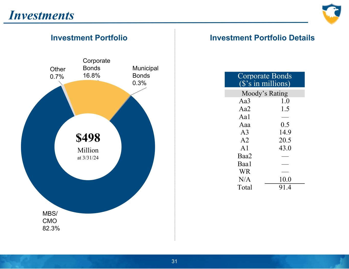 Investments Corporate Bonds ($’s in millions) Moody’s Rating Aa3 1.0 Aa2 1.5 Aa1 — Aaa 0.5 A3 14.9 A2 20.5 A1 43.0 Baa2 — Baa1 — WR — N/A 10.0 Total 91.4 31 MBS/ CMO 82.3% Other 0.7% Corporate Bonds 16.8% Municipal Bonds 0.3% $498 Million at 3/31/24 Investment Portfolio Investment Portfolio Details