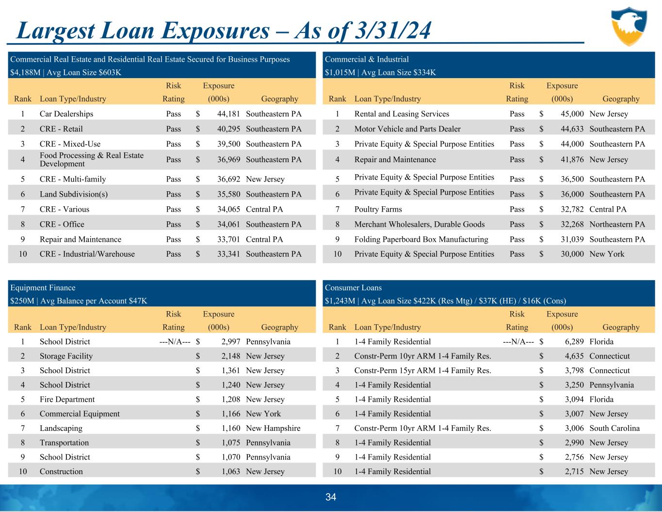Largest Loan Exposures – As of 3/31/24 34 Commercial Real Estate and Residential Real Estate Secured for Business Purposes Commercial & Industrial $4,188M | Avg Loan Size $603K $1,015M | Avg Loan Size $334K Risk Exposure Risk Exposure Rank Loan Type/Industry Rating (000s) Geography Rank Loan Type/Industry Rating (000s) Geography 1 Car Dealerships Pass $ 44,181 Southeastern PA 1 Rental and Leasing Services Pass $ 45,000 New Jersey 2 CRE - Retail Pass $ 40,295 Southeastern PA 2 Motor Vehicle and Parts Dealer Pass $ 44,633 Southeastern PA 3 CRE - Mixed-Use Pass $ 39,500 Southeastern PA 3 Private Equity & Special Purpose Entities Pass $ 44,000 Southeastern PA 4 Food Processing & Real Estate Development Pass $ 36,969 Southeastern PA 4 Repair and Maintenance Pass $ 41,876 New Jersey 5 CRE - Multi-family Pass $ 36,692 New Jersey 5 Private Equity & Special Purpose Entities Pass $ 36,500 Southeastern PA 6 Land Subdivision(s) Pass $ 35,580 Southeastern PA 6 Private Equity & Special Purpose Entities Pass $ 36,000 Southeastern PA 7 CRE - Various Pass $ 34,065 Central PA 7 Poultry Farms Pass $ 32,782 Central PA 8 CRE - Office Pass $ 34,061 Southeastern PA 8 Merchant Wholesalers, Durable Goods Pass $ 32,268 Northeastern PA 9 Repair and Maintenance Pass $ 33,701 Central PA 9 Folding Paperboard Box Manufacturing Pass $ 31,039 Southeastern PA 10 CRE - Industrial/Warehouse Pass $ 33,341 Southeastern PA 10 Private Equity & Special Purpose Entities Pass $ 30,000 New York Equipment Finance Consumer Loans $250M | Avg Balance per Account $47K $1,243M | Avg Loan Size $422K (Res Mtg) / $37K (HE) / $16K (Cons) Risk Exposure Risk Exposure Rank Loan Type/Industry Rating (000s) Geography Rank Loan Type/Industry Rating (000s) Geography 1 School District ‘---N/A--- $ 2,997 Pennsylvania 1 1-4 Family Residential ‘---N/A--- $ 6,289 Florida 2 Storage Facility $ 2,148 New Jersey 2 Constr-Perm 10yr ARM 1-4 Family Res. $ 4,635 Connecticut 3 School District $ 1,361 New Jersey 3 Constr-Perm 15yr ARM 1-4 Family Res. $ 3,798 Connecticut 4 School District $ 1,240 New Jersey 4 1-4 Family Residential $ 3,250 Pennsylvania 5 Fire Department $ 1,208 New Jersey 5 1-4 Family Residential $ 3,094 Florida 6 Commercial Equipment $ 1,166 New York 6 1-4 Family Residential $ 3,007 New Jersey 7 Landscaping $ 1,160 New Hampshire 7 Constr-Perm 10yr ARM 1-4 Family Res. $ 3,006 South Carolina 8 Transportation $ 1,075 Pennsylvania 8 1-4 Family Residential $ 2,990 New Jersey 9 School District $ 1,070 Pennsylvania 9 1-4 Family Residential $ 2,756 New Jersey 10 Construction $ 1,063 New Jersey 10 1-4 Family Residential $ 2,715 New Jersey