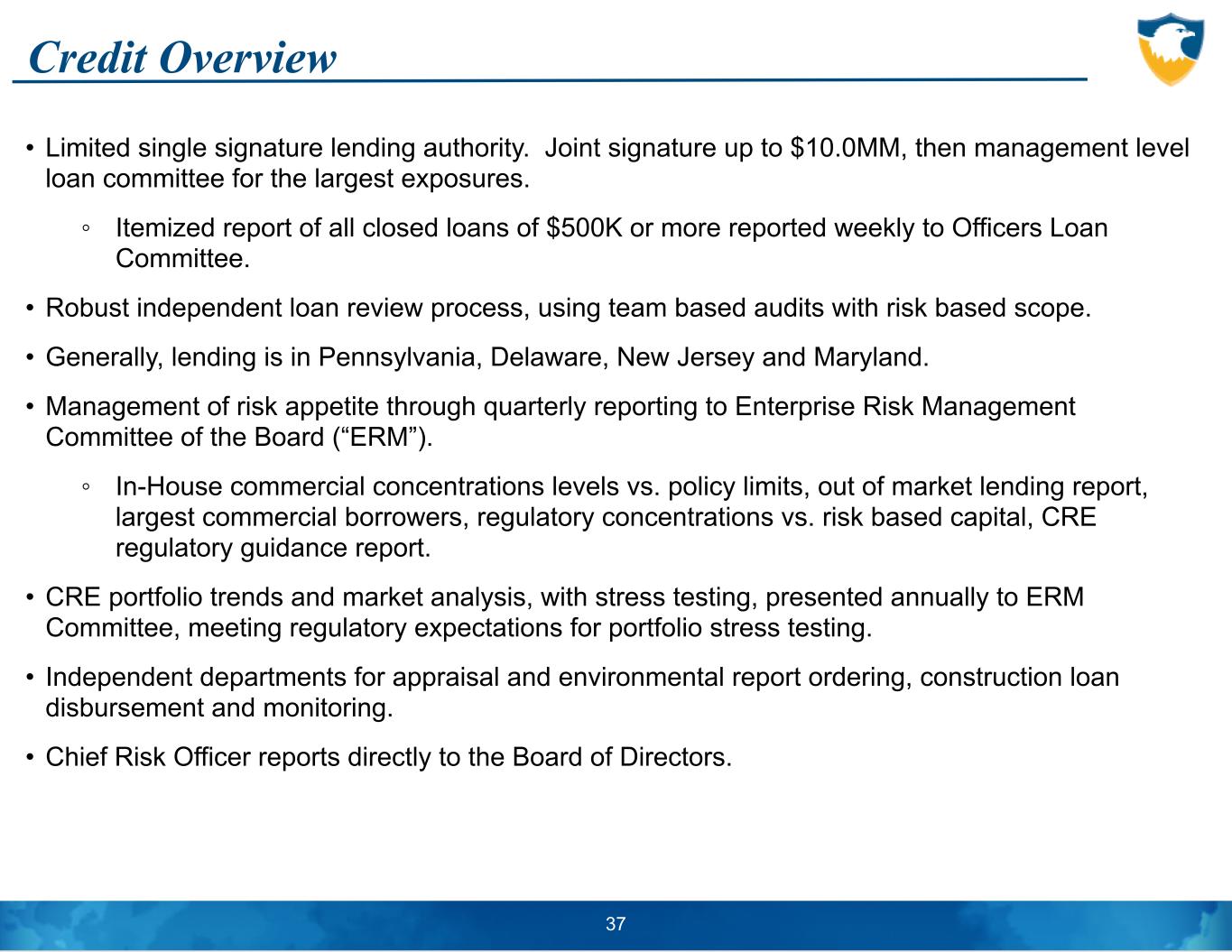 • Limited single signature lending authority. Joint signature up to $10.0MM, then management level loan committee for the largest exposures. ◦ Itemized report of all closed loans of $500K or more reported weekly to Officers Loan Committee. • Robust independent loan review process, using team based audits with risk based scope. • Generally, lending is in Pennsylvania, Delaware, New Jersey and Maryland. • Management of risk appetite through quarterly reporting to Enterprise Risk Management Committee of the Board (“ERM”). ◦ In-House commercial concentrations levels vs. policy limits, out of market lending report, largest commercial borrowers, regulatory concentrations vs. risk based capital, CRE regulatory guidance report. • CRE portfolio trends and market analysis, with stress testing, presented annually to ERM Committee, meeting regulatory expectations for portfolio stress testing. • Independent departments for appraisal and environmental report ordering, construction loan disbursement and monitoring. • Chief Risk Officer reports directly to the Board of Directors. Credit Overview 37