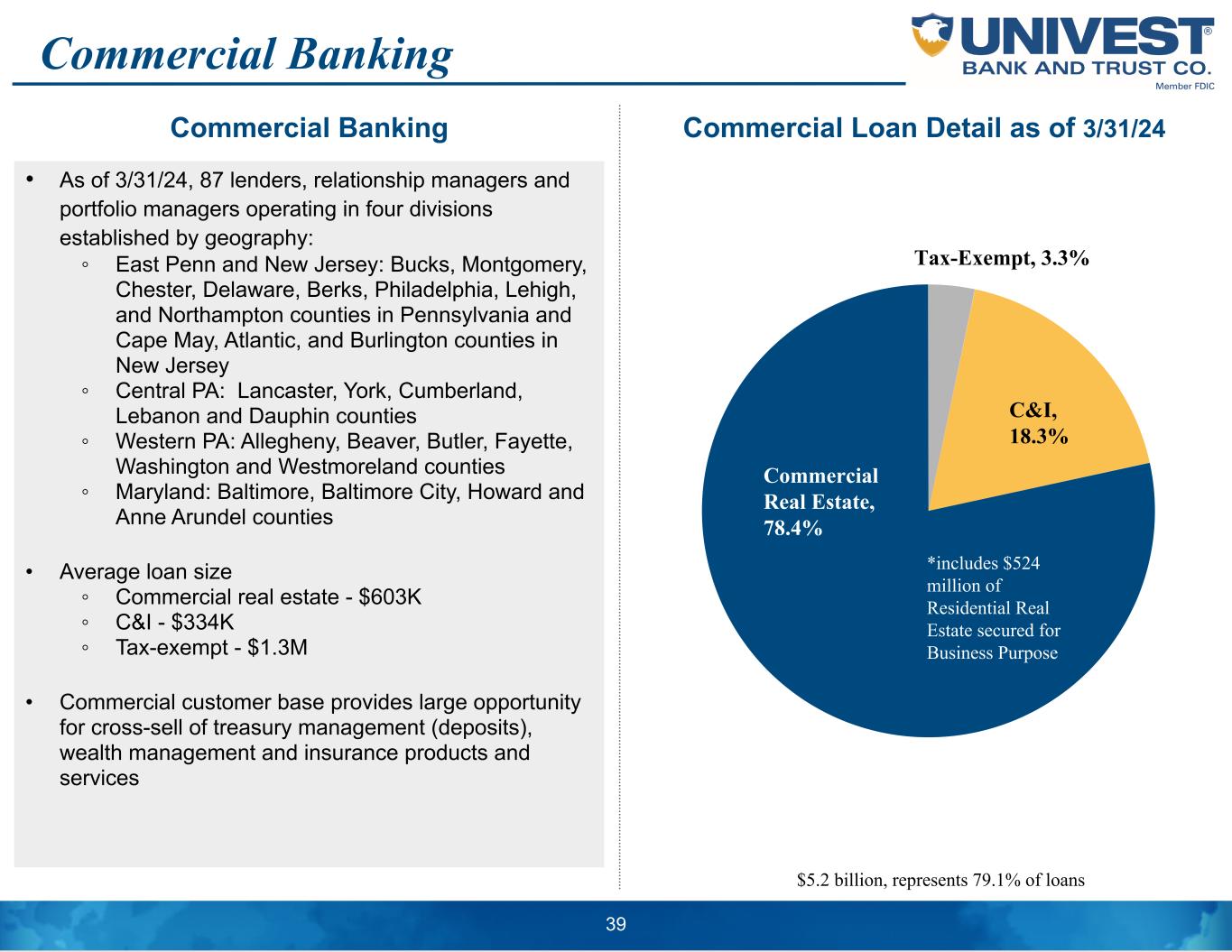 Commercial Banking • As of 3/31/24, 87 lenders, relationship managers and portfolio managers operating in four divisions established by geography: ◦ East Penn and New Jersey: Bucks, Montgomery, Chester, Delaware, Berks, Philadelphia, Lehigh, and Northampton counties in Pennsylvania and Cape May, Atlantic, and Burlington counties in New Jersey ◦ Central PA: Lancaster, York, Cumberland, Lebanon and Dauphin counties ◦ Western PA: Allegheny, Beaver, Butler, Fayette, Washington and Westmoreland counties ◦ Maryland: Baltimore, Baltimore City, Howard and Anne Arundel counties • Average loan size ◦ Commercial real estate - $603K ◦ C&I - $334K ◦ Tax-exempt - $1.3M • Commercial customer base provides large opportunity for cross-sell of treasury management (deposits), wealth management and insurance products and services Tax-Exempt, 3.3% C&I, 18.3% Commercial Real Estate, 78.4% $5.2 billion, represents 79.1% of loans *includes $524 million of Residential Real Estate secured for Business Purpose 39 Commercial Banking Commercial Loan Detail as of 3/31/24