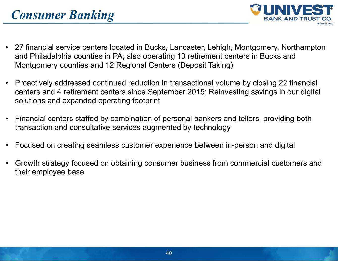 Consumer Banking • 27 financial service centers located in Bucks, Lancaster, Lehigh, Montgomery, Northampton and Philadelphia counties in PA; also operating 10 retirement centers in Bucks and Montgomery counties and 12 Regional Centers (Deposit Taking) • Proactively addressed continued reduction in transactional volume by closing 22 financial centers and 4 retirement centers since September 2015; Reinvesting savings in our digital solutions and expanded operating footprint • Financial centers staffed by combination of personal bankers and tellers, providing both transaction and consultative services augmented by technology • Focused on creating seamless customer experience between in-person and digital • Growth strategy focused on obtaining consumer business from commercial customers and their employee base 40