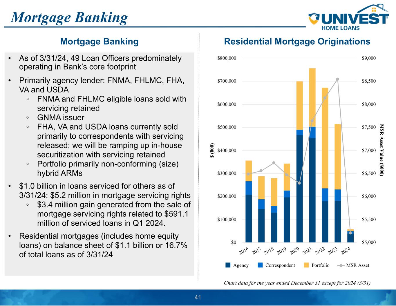 Mortgage Banking • As of 3/31/24, 49 Loan Officers predominately operating in Bank’s core footprint • Primarily agency lender: FNMA, FHLMC, FHA, VA and USDA ◦ FNMA and FHLMC eligible loans sold with servicing retained ◦ GNMA issuer ◦ FHA, VA and USDA loans currently sold primarily to correspondents with servicing released; we will be ramping up in-house securitization with servicing retained ◦ Portfolio primarily non-conforming (size) hybrid ARMs • $1.0 billion in loans serviced for others as of 3/31/24; $5.2 million in mortgage servicing rights ◦ $3.4 million gain generated from the sale of mortgage servicing rights related to $591.1 million of serviced loans in Q1 2024. • Residential mortgages (includes home equity loans) on balance sheet of $1.1 billion or 16.7% of total loans as of 3/31/24 Chart data for the year ended December 31 except for 2024 (3/31) 41 $ (0 00 ) M SR A sset V alue ($000) Agency Correspondent Portfolio MSR Asset 2016 2017 2018 2019 2020 2021 2022 2023 2024 $0 $100,000 $200,000 $300,000 $400,000 $500,000 $600,000 $700,000 $800,000 $5,000 $5,500 $6,000 $6,500 $7,000 $7,500 $8,000 $8,500 $9,000 Mortgage Banking Residential Mortgage Originations