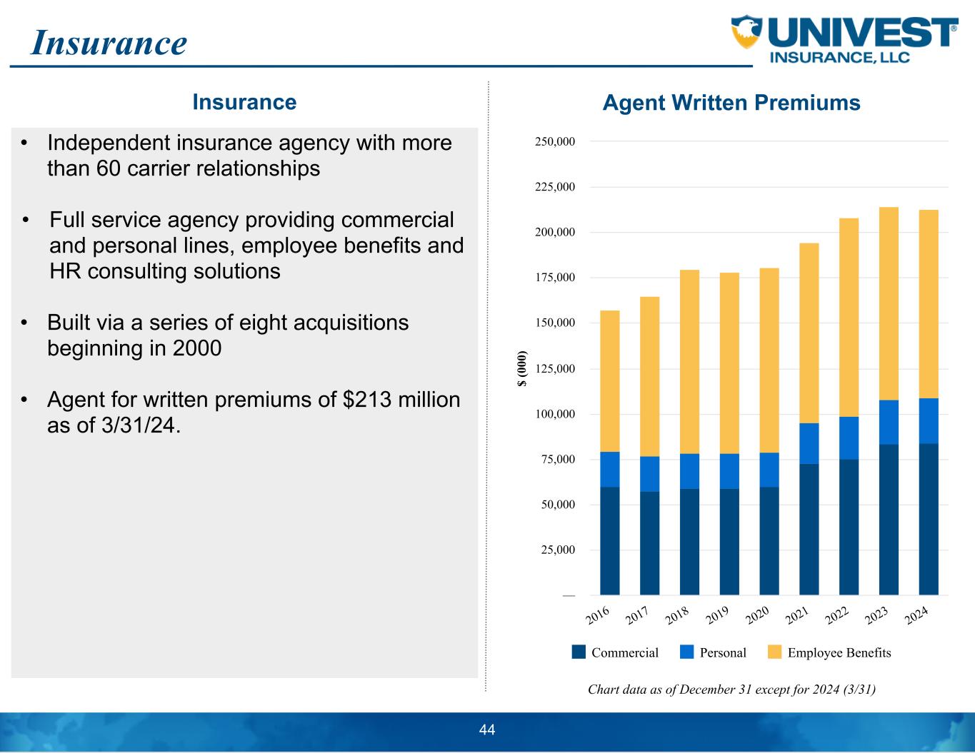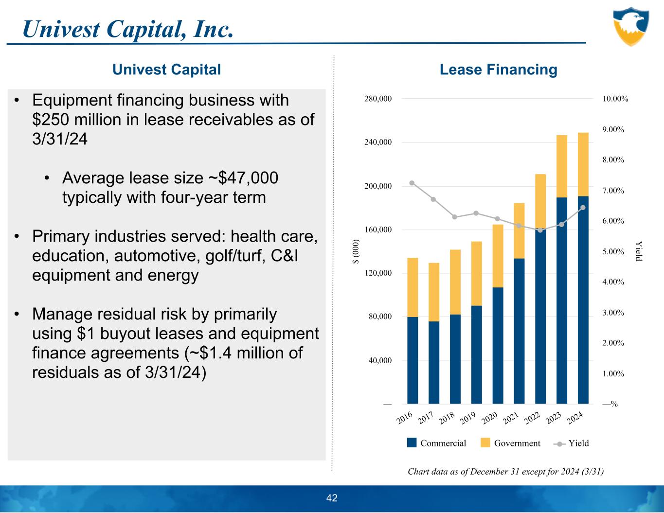 Univest Capital, Inc. • Equipment financing business with $250 million in lease receivables as of 3/31/24 • Average lease size ~$47,000 typically with four-year term • Primary industries served: health care, education, automotive, golf/turf, C&I equipment and energy • Manage residual risk by primarily using $1 buyout leases and equipment finance agreements (~$1.4 million of residuals as of 3/31/24) Chart data as of December 31 except for 2024 (3/31) 42 $ (0 00 ) Y ield Commercial Government Yield 2016 2017 2018 2019 2020 2021 2022 2023 2024 — 40,000 80,000 120,000 160,000 200,000 240,000 280,000 —% 1.00% 2.00% 3.00% 4.00% 5.00% 6.00% 7.00% 8.00% 9.00% 10.00% Univest Capital Lease Financing