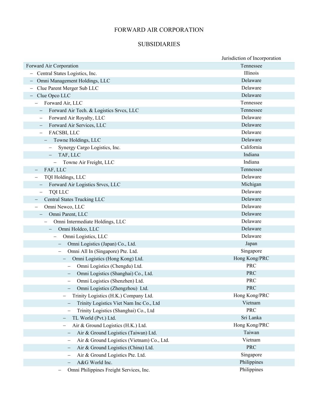 FORWARD AIR CORPORATION SUBSIDIARIES Jurisdiction of Incorporation Forward Air Corporation Tennessee Central States Logistics, Inc. Illinois Omni Management Holdings, LLC Delaware Clue Parent Merger Sub LLC Delaware Clue Opco LLC Delaware Forward Air, LLC Tennessee Forward Air Tech. & Logistics Srvcs, LLC Tennessee Forward Air Royalty, LLC Delaware Forward Air Services, LLC Delaware FACSBI, LLC Delaware Towne Holdings, LLC Delaware Synergy Cargo Logistics, Inc. California TAF, LLC Indiana Towne Air Freight, LLC Indiana FAF, LLC Tennessee TQI Holdings, LLC Delaware Forward Air Logistics Srvcs, LLC Michigan TQI LLC Delaware Central States Trucking LLC Delaware Omni Newco, LLC Delaware Omni Parent, LLC Delaware Omni Intermediate Holdings, LLC Delaware Omni Holdco, LLC Delaware Omni Logistics, LLC Delaware Omni Logistics (Japan) Co., Ltd. Japan Omni All In (Singapore) Pte. Ltd. Singapore Omni Logistics (Hong Kong) Ltd. Hong Kong/PRC Omni Logistics (Chengdu) Ltd. PRC Omni Logistics (Shanghai) Co., Ltd. PRC Omni Logistics (Shenzhen) Ltd. PRC Omni Logistics (Zhengzhou) Ltd. PRC Trinity Logistics (H.K.) Company Ltd. Hong Kong/PRC Trinity Logistics Viet Nam Inc Co., Ltd Vietnam Trinity Logistics (Shanghai) Co., Ltd PRC TL World (Pvt.) Ltd. Sri Lanka Air & Ground Logistics (H.K.) Ltd. Hong Kong/PRC Air & Ground Logistics (Taiwan) Ltd. Taiwan Air & Ground Logistics (Vietnam) Co., Ltd. Vietnam Air & Ground Logistics (China) Ltd. PRC Air & Ground Logistics Pte. Ltd. Singapore A&G World Inc. Philippines Omni Philippines Freight Services, Inc. Philippines