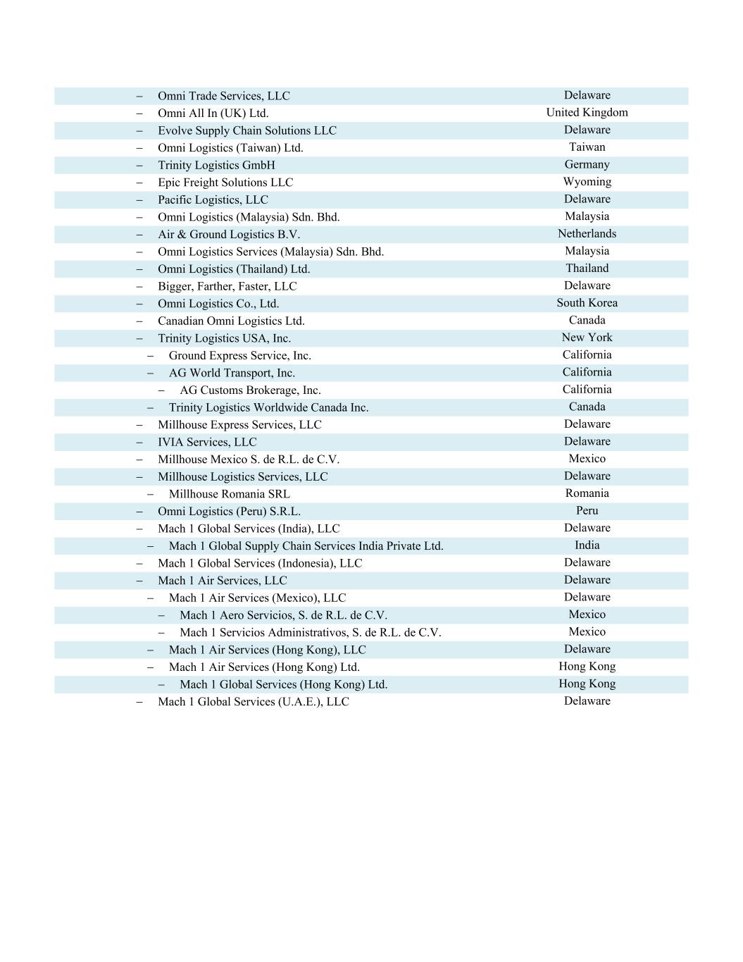 Omni Trade Services, LLC Delaware Omni All In (UK) Ltd. United Kingdom Evolve Supply Chain Solutions LLC Delaware Omni Logistics (Taiwan) Ltd. Taiwan Trinity Logistics GmbH Germany Epic Freight Solutions LLC Wyoming Pacific Logistics, LLC Delaware Omni Logistics (Malaysia) Sdn. Bhd. Malaysia Air & Ground Logistics B.V. Netherlands Omni Logistics Services (Malaysia) Sdn. Bhd. Malaysia Omni Logistics (Thailand) Ltd. Thailand Bigger, Farther, Faster, LLC Delaware Omni Logistics Co., Ltd. South Korea Canadian Omni Logistics Ltd. Canada Trinity Logistics USA, Inc. New York Ground Express Service, Inc. California AG World Transport, Inc. California AG Customs Brokerage, Inc. California Trinity Logistics Worldwide Canada Inc. Canada Millhouse Express Services, LLC Delaware IVIA Services, LLC Delaware Millhouse Mexico S. de R.L. de C.V. Mexico Millhouse Logistics Services, LLC Delaware Millhouse Romania SRL Romania Omni Logistics (Peru) S.R.L. Peru Mach 1 Global Services (India), LLC Delaware Mach 1 Global Supply Chain Services India Private Ltd. India Mach 1 Global Services (Indonesia), LLC Delaware Mach 1 Air Services, LLC Delaware Mach 1 Air Services (Mexico), LLC Delaware Mach 1 Aero Servicios, S. de R.L. de C.V. Mexico Mach 1 Servicios Administrativos, S. de R.L. de C.V. Mexico Mach 1 Air Services (Hong Kong), LLC Delaware Mach 1 Air Services (Hong Kong) Ltd. Hong Kong Mach 1 Global Services (Hong Kong) Ltd. Hong Kong Mach 1 Global Services (U.A.E.), LLC Delaware