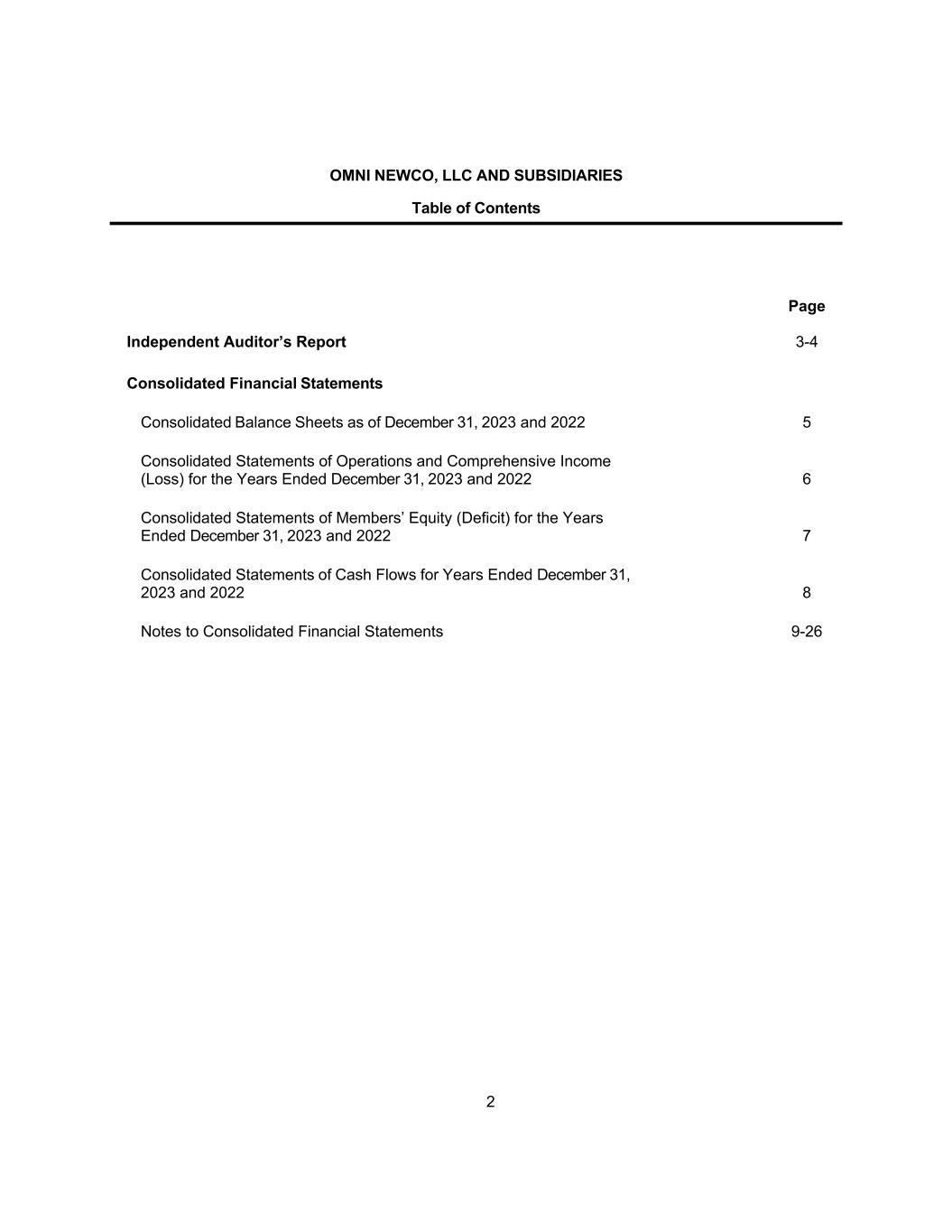 2 OMNI NEWCO, LLC AND SUBSIDIARIES Table of Contents Page Independent Auditor’s Report 3-4 Consolidated Financial Statements Consolidated Balance Sheets as of December 31, 2023 and 2022 5 Consolidated Statements of Operations and Comprehensive Income (Loss) for the Years Ended December 31, 2023 and 2022 6 Consolidated Statements of Members’ Equity (Deficit) for the Years Ended December 31, 2023 and 2022 7 Consolidated Statements of Cash Flows for Years Ended December 31, 2023 and 2022 8 Notes to Consolidated Financial Statements 9-26