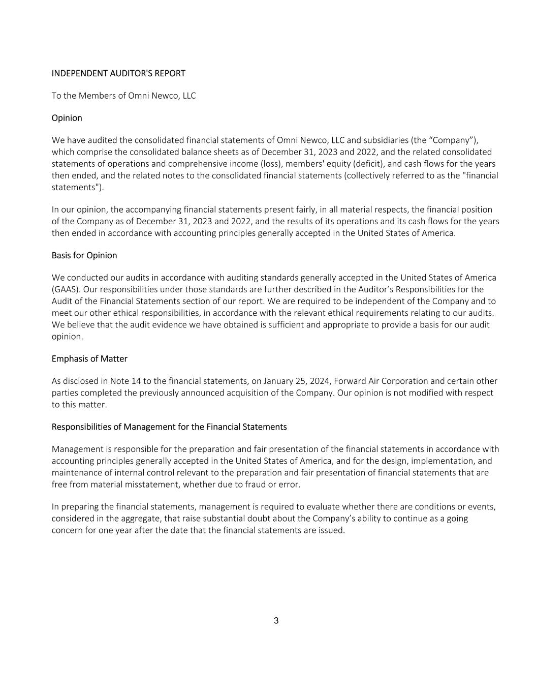 3 INDEPENDENT AUDITOR'S REPORT To the Members of Omni Newco, LLC Opinion We have audited the consolidated financial statements of Omni Newco, LLC and subsidiaries (the “Company”), which comprise the consolidated balance sheets as of December 31, 2023 and 2022, and the related consolidated statements of operations and comprehensive income (loss), members' equity (deficit), and cash flows for the years then ended, and the related notes to the consolidated financial statements (collectively referred to as the "financial statements"). In our opinion, the accompanying financial statements present fairly, in all material respects, the financial position of the Company as of December 31, 2023 and 2022, and the results of its operations and its cash flows for the years then ended in accordance with accounting principles generally accepted in the United States of America. Basis for Opinion We conducted our audits in accordance with auditing standards generally accepted in the United States of America (GAAS). Our responsibilities under those standards are further described in the Auditor’s Responsibilities for the Audit of the Financial Statements section of our report. We are required to be independent of the Company and to meet our other ethical responsibilities, in accordance with the relevant ethical requirements relating to our audits. We believe that the audit evidence we have obtained is sufficient and appropriate to provide a basis for our audit opinion. Emphasis of Matter As disclosed in Note 14 to the financial statements, on January 25, 2024, Forward Air Corporation and certain other parties completed the previously announced acquisition of the Company. Our opinion is not modified with respect to this matter. Responsibilities of Management for the Financial Statements Management is responsible for the preparation and fair presentation of the financial statements in accordance with accounting principles generally accepted in the United States of America, and for the design, implementation, and maintenance of internal control relevant to the preparation and fair presentation of financial statements that are free from material misstatement, whether due to fraud or error. In preparing the financial statements, management is required to evaluate whether there are conditions or events, considered in the aggregate, that raise substantial doubt about the Company’s ability to continue as a going concern for one year after the date that the financial statements are issued.