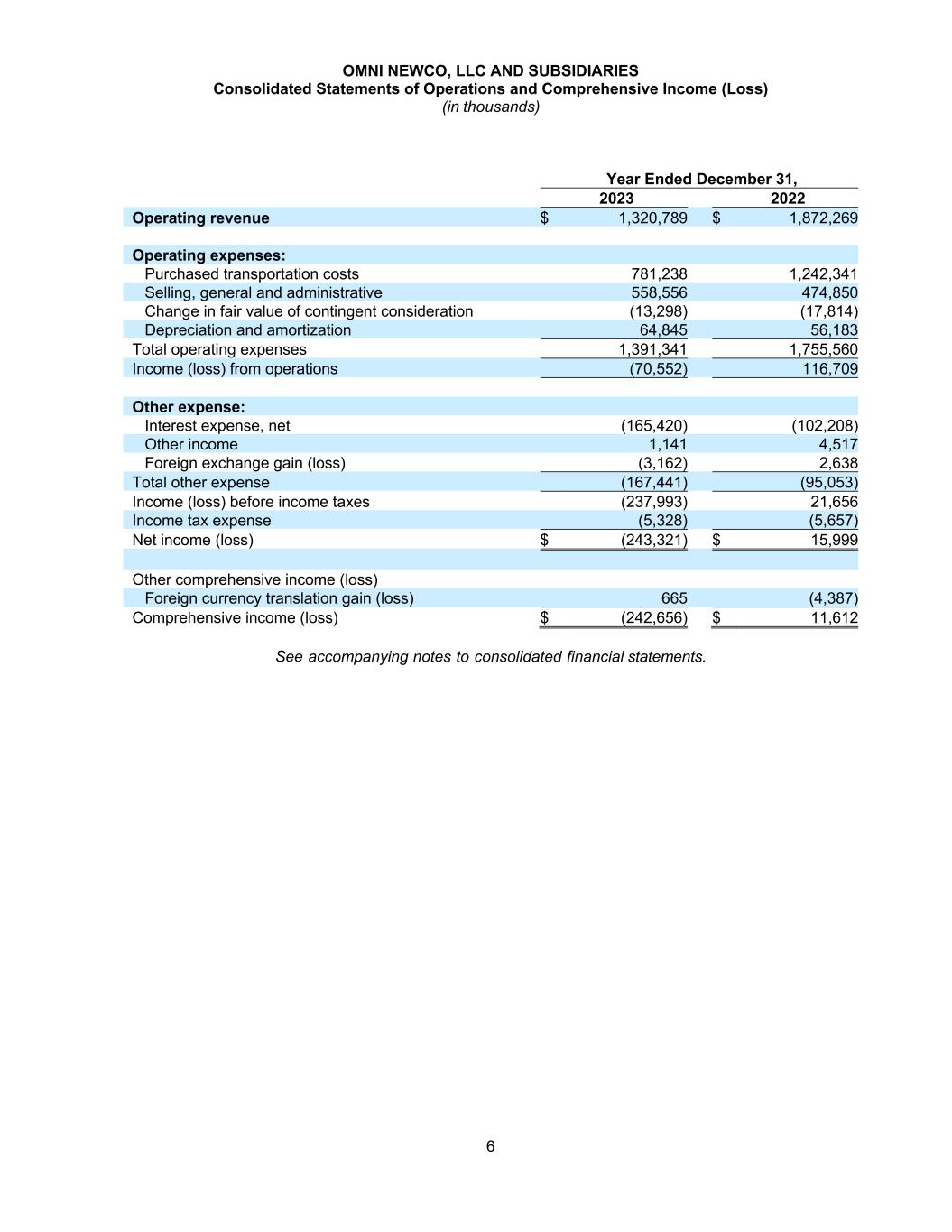 OMNI NEWCO, LLC AND SUBSIDIARIES Consolidated Statements of Operations and Comprehensive Income (Loss) (in thousands) 6 Year Ended December 31, 2023 2022 Operating revenue $ 1,320,789 $ 1,872,269 Operating expenses: Purchased transportation costs 781,238 1,242,341 Selling, general and administrative 558,556 474,850 Change in fair value of contingent consideration (13,298) (17,814) Depreciation and amortization 64,845 56,183 Total operating expenses 1,391,341 1,755,560 Income (loss) from operations (70,552) 116,709 Other expense: Interest expense, net (165,420) (102,208) Other income 1,141 4,517 Foreign exchange gain (loss) (3,162) 2,638 Total other expense (167,441) (95,053) Income (loss) before income taxes (237,993) 21,656 Income tax expense (5,328) (5,657) Net income (loss) $ (243,321) $ 15,999 Other comprehensive income (loss) Foreign currency translation gain (loss) 665 (4,387) Comprehensive income (loss) $ (242,656) $ 11,612 See accompanying notes to consolidated financial statements.