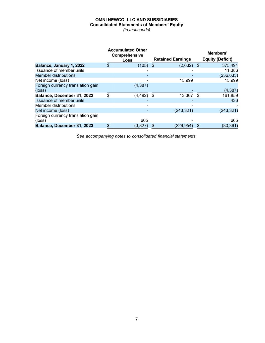 OMNI NEWCO, LLC AND SUBSIDIARIES Consolidated Statements of Members’ Equity (in thousands) 7 Accumulated Other Comprehensive Loss Retained Earnings Members’ Equity (Deficit) Balance, January 1, 2022 $ (105) $ (2,632) $ 375,494 Issuance of member units - - 11,386 Member distributions - - (236,633) Net income (loss) - 15,999 15,999 Foreign currency translation gain (loss) (4,387) - (4,387) Balance, December 31, 2022 $ (4,492) $ 13,367 $ 161,859 Issuance of member units - - 436 Member distributions - - - Net income (loss) - (243,321) (243,321) Foreign currency translation gain (loss) 665 - 665 Balance, December 31, 2023 $ (3,827) $ (229,954) $ (80,361) See accompanying notes to consolidated financial statements.