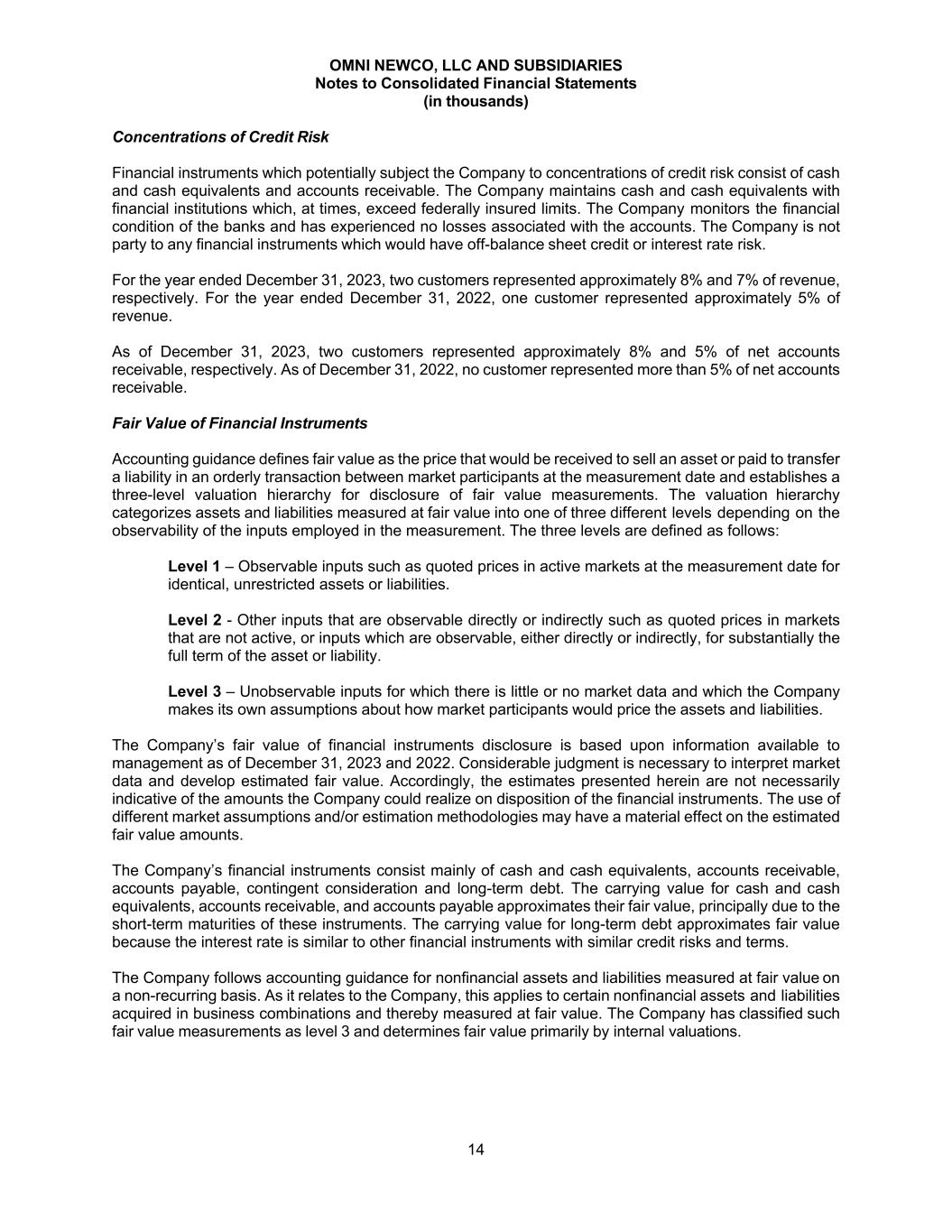OMNI NEWCO, LLC AND SUBSIDIARIES Notes to Consolidated Financial Statements (in thousands) 14 Concentrations of Credit Risk Financial instruments which potentially subject the Company to concentrations of credit risk consist of cash and cash equivalents and accounts receivable. The Company maintains cash and cash equivalents with financial institutions which, at times, exceed federally insured limits. The Company monitors the financial condition of the banks and has experienced no losses associated with the accounts. The Company is not party to any financial instruments which would have off-balance sheet credit or interest rate risk. For the year ended December 31, 2023, two customers represented approximately 8% and 7% of revenue, respectively. For the year ended December 31, 2022, one customer represented approximately 5% of revenue. As of December 31, 2023, two customers represented approximately 8% and 5% of net accounts receivable, respectively. As of December 31, 2022, no customer represented more than 5% of net accounts receivable. Fair Value of Financial Instruments Accounting guidance defines fair value as the price that would be received to sell an asset or paid to transfer a liability in an orderly transaction between market participants at the measurement date and establishes a three-level valuation hierarchy for disclosure of fair value measurements. The valuation hierarchy categorizes assets and liabilities measured at fair value into one of three different levels depending on the observability of the inputs employed in the measurement. The three levels are defined as follows: Level 1 – Observable inputs such as quoted prices in active markets at the measurement date for identical, unrestricted assets or liabilities. Level 2 - Other inputs that are observable directly or indirectly such as quoted prices in markets that are not active, or inputs which are observable, either directly or indirectly, for substantially the full term of the asset or liability. Level 3 – Unobservable inputs for which there is little or no market data and which the Company makes its own assumptions about how market participants would price the assets and liabilities. The Company’s fair value of financial instruments disclosure is based upon information available to management as of December 31, 2023 and 2022. Considerable judgment is necessary to interpret market data and develop estimated fair value. Accordingly, the estimates presented herein are not necessarily indicative of the amounts the Company could realize on disposition of the financial instruments. The use of different market assumptions and/or estimation methodologies may have a material effect on the estimated fair value amounts. The Company’s financial instruments consist mainly of cash and cash equivalents, accounts receivable, accounts payable, contingent consideration and long-term debt. The carrying value for cash and cash equivalents, accounts receivable, and accounts payable approximates their fair value, principally due to the short-term maturities of these instruments. The carrying value for long-term debt approximates fair value because the interest rate is similar to other financial instruments with similar credit risks and terms. The Company follows accounting guidance for nonfinancial assets and liabilities measured at fair value on a non-recurring basis. As it relates to the Company, this applies to certain nonfinancial assets and liabilities acquired in business combinations and thereby measured at fair value. The Company has classified such fair value measurements as level 3 and determines fair value primarily by internal valuations.