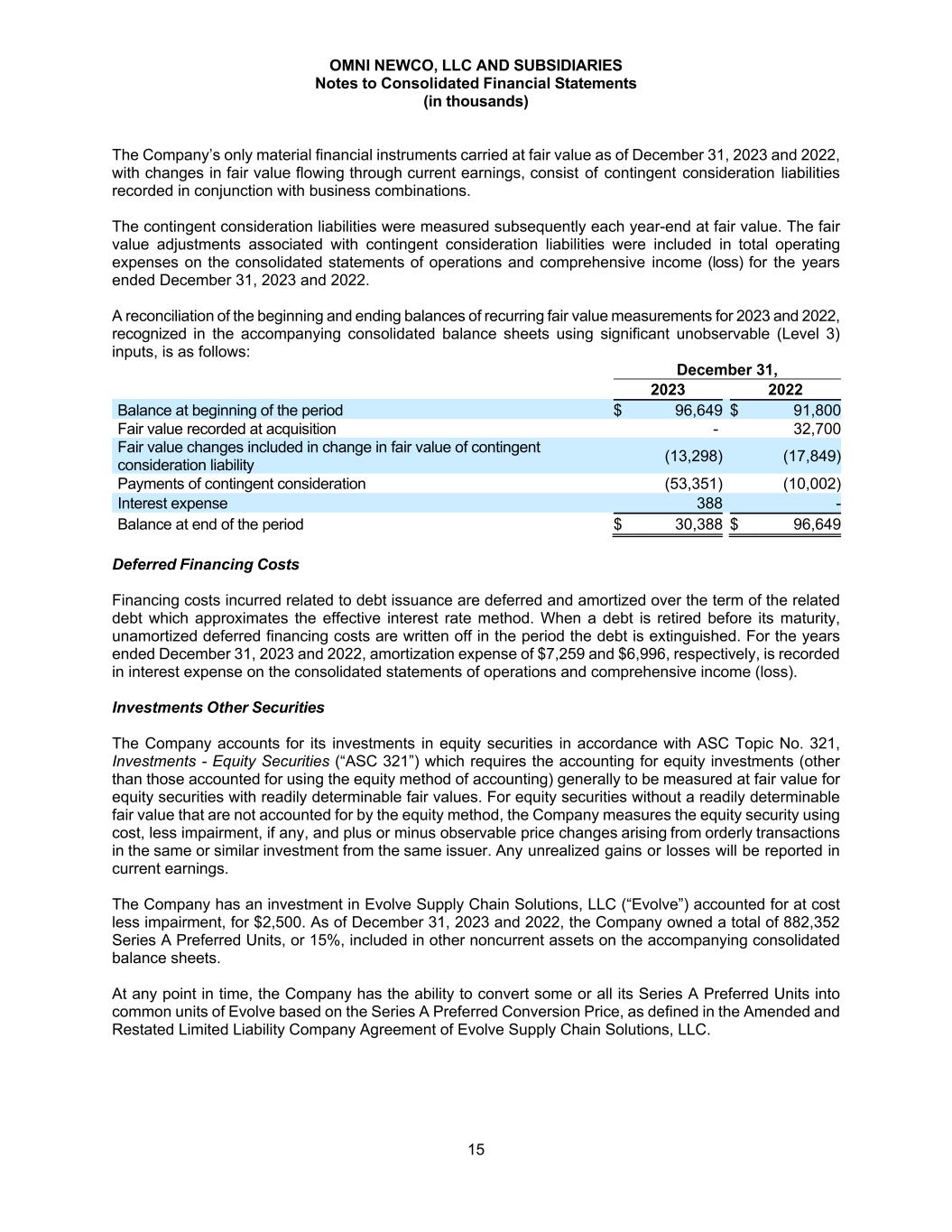 OMNI NEWCO, LLC AND SUBSIDIARIES Notes to Consolidated Financial Statements (in thousands) 15 The Company’s only material financial instruments carried at fair value as of December 31, 2023 and 2022, with changes in fair value flowing through current earnings, consist of contingent consideration liabilities recorded in conjunction with business combinations. The contingent consideration liabilities were measured subsequently each year-end at fair value. The fair value adjustments associated with contingent consideration liabilities were included in total operating expenses on the consolidated statements of operations and comprehensive income (loss) for the years ended December 31, 2023 and 2022. A reconciliation of the beginning and ending balances of recurring fair value measurements for 2023 and 2022, recognized in the accompanying consolidated balance sheets using significant unobservable (Level 3) inputs, is as follows: December 31, 2023 2022 Balance at beginning of the period $ 96,649 $ 91,800 Fair value recorded at acquisition - 32,700 Fair value changes included in change in fair value of contingent consideration liability (13,298) (17,849) Payments of contingent consideration (53,351) (10,002) Interest expense 388 - Balance at end of the period $ 30,388 $ 96,649 Deferred Financing Costs Financing costs incurred related to debt issuance are deferred and amortized over the term of the related debt which approximates the effective interest rate method. When a debt is retired before its maturity, unamortized deferred financing costs are written off in the period the debt is extinguished. For the years ended December 31, 2023 and 2022, amortization expense of $7,259 and $6,996, respectively, is recorded in interest expense on the consolidated statements of operations and comprehensive income (loss). Investments Other Securities The Company accounts for its investments in equity securities in accordance with ASC Topic No. 321, Investments - Equity Securities (“ASC 321”) which requires the accounting for equity investments (other than those accounted for using the equity method of accounting) generally to be measured at fair value for equity securities with readily determinable fair values. For equity securities without a readily determinable fair value that are not accounted for by the equity method, the Company measures the equity security using cost, less impairment, if any, and plus or minus observable price changes arising from orderly transactions in the same or similar investment from the same issuer. Any unrealized gains or losses will be reported in current earnings. The Company has an investment in Evolve Supply Chain Solutions, LLC (“Evolve”) accounted for at cost less impairment, for $2,500. As of December 31, 2023 and 2022, the Company owned a total of 882,352 Series A Preferred Units, or 15%, included in other noncurrent assets on the accompanying consolidated balance sheets. At any point in time, the Company has the ability to convert some or all its Series A Preferred Units into common units of Evolve based on the Series A Preferred Conversion Price, as defined in the Amended and Restated Limited Liability Company Agreement of Evolve Supply Chain Solutions, LLC.