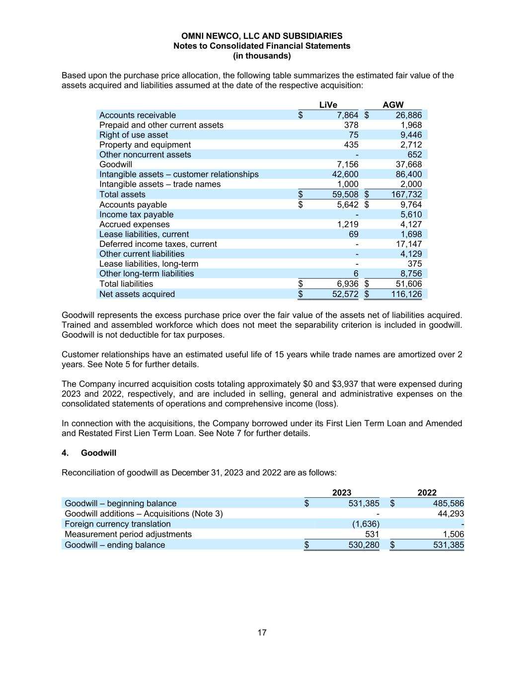 OMNI NEWCO, LLC AND SUBSIDIARIES Notes to Consolidated Financial Statements (in thousands) 17 Based upon the purchase price allocation, the following table summarizes the estimated fair value of the assets acquired and liabilities assumed at the date of the respective acquisition: LiVe AGW Accounts receivable $ 7,864 $ 26,886 Prepaid and other current assets 378 1,968 Right of use asset 75 9,446 Property and equipment 435 2,712 Other noncurrent assets - 652 Goodwill 7,156 37,668 Intangible assets – customer relationships 42,600 86,400 Intangible assets – trade names 1,000 2,000 Total assets $ 59,508 $ 167,732 Accounts payable $ 5,642 $ 9,764 Income tax payable - 5,610 Accrued expenses 1,219 4,127 Lease liabilities, current 69 1,698 Deferred income taxes, current - 17,147 Other current liabilities - 4,129 Lease liabilities, long-term - 375 Other long-term liabilities 6 8,756 Total liabilities $ 6,936 $ 51,606 Net assets acquired $ 52,572 $ 116,126 Goodwill represents the excess purchase price over the fair value of the assets net of liabilities acquired. Trained and assembled workforce which does not meet the separability criterion is included in goodwill. Goodwill is not deductible for tax purposes. Customer relationships have an estimated useful life of 15 years while trade names are amortized over 2 years. See Note 5 for further details. The Company incurred acquisition costs totaling approximately $0 and $3,937 that were expensed during 2023 and 2022, respectively, and are included in selling, general and administrative expenses on the consolidated statements of operations and comprehensive income (loss). In connection with the acquisitions, the Company borrowed under its First Lien Term Loan and Amended and Restated First Lien Term Loan. See Note 7 for further details. 4. Goodwill Reconciliation of goodwill as December 31, 2023 and 2022 are as follows: 2023 2022 Goodwill – beginning balance $ 531,385 $ 485,586 Goodwill additions – Acquisitions (Note 3) - 44,293 Foreign currency translation (1,636) - Measurement period adjustments 531 1,506 Goodwill – ending balance $ 530,280 $ 531,385